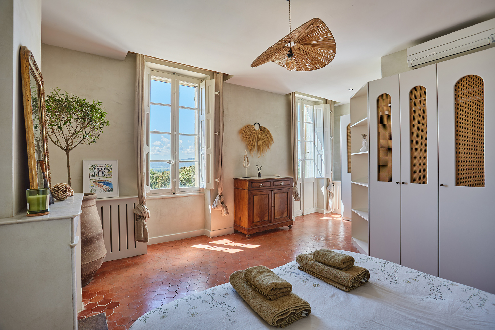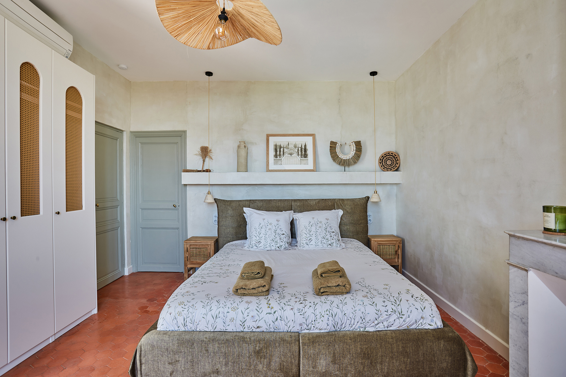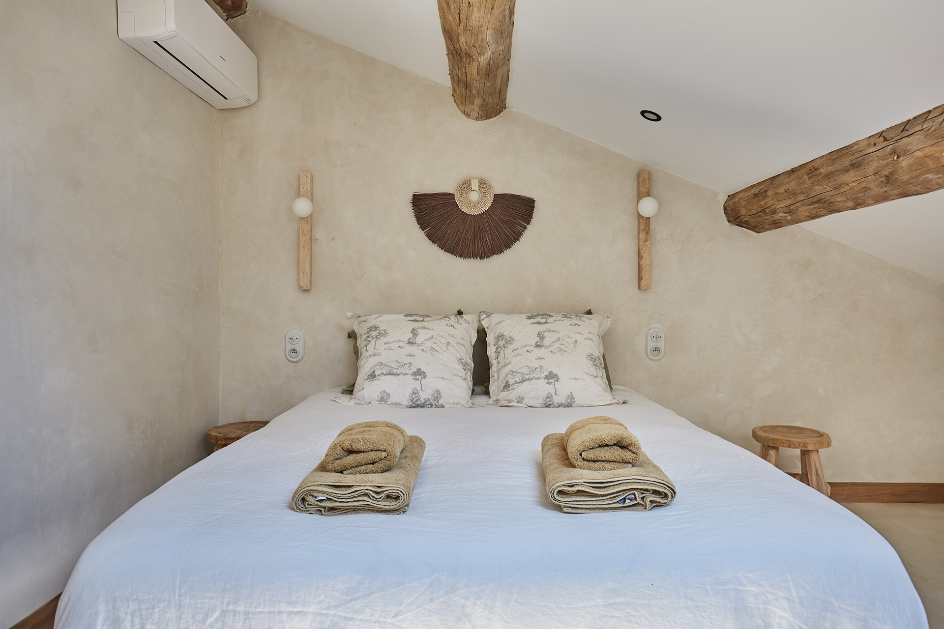 Les chambres, simples et poétiques, conservent l’esprit authentique de la maison. Les poutres apparentes ont été restaurées par sablage, et le bois naturel a été traité pour mettre en valeur sa texture. La tête de lit, réalisée en paille tressée, apporte une touche artisanale à la pièce. Les murs, badigeonnés à la chaux couleur sable clair, créent une ambiance douce et chaleureuse. Les penderies en bois, réalisées sur mesure, possèdent des ouvertures centrales arquées, et les radiateurs ont été dissimulés derrière des plaques en bois ajouré.