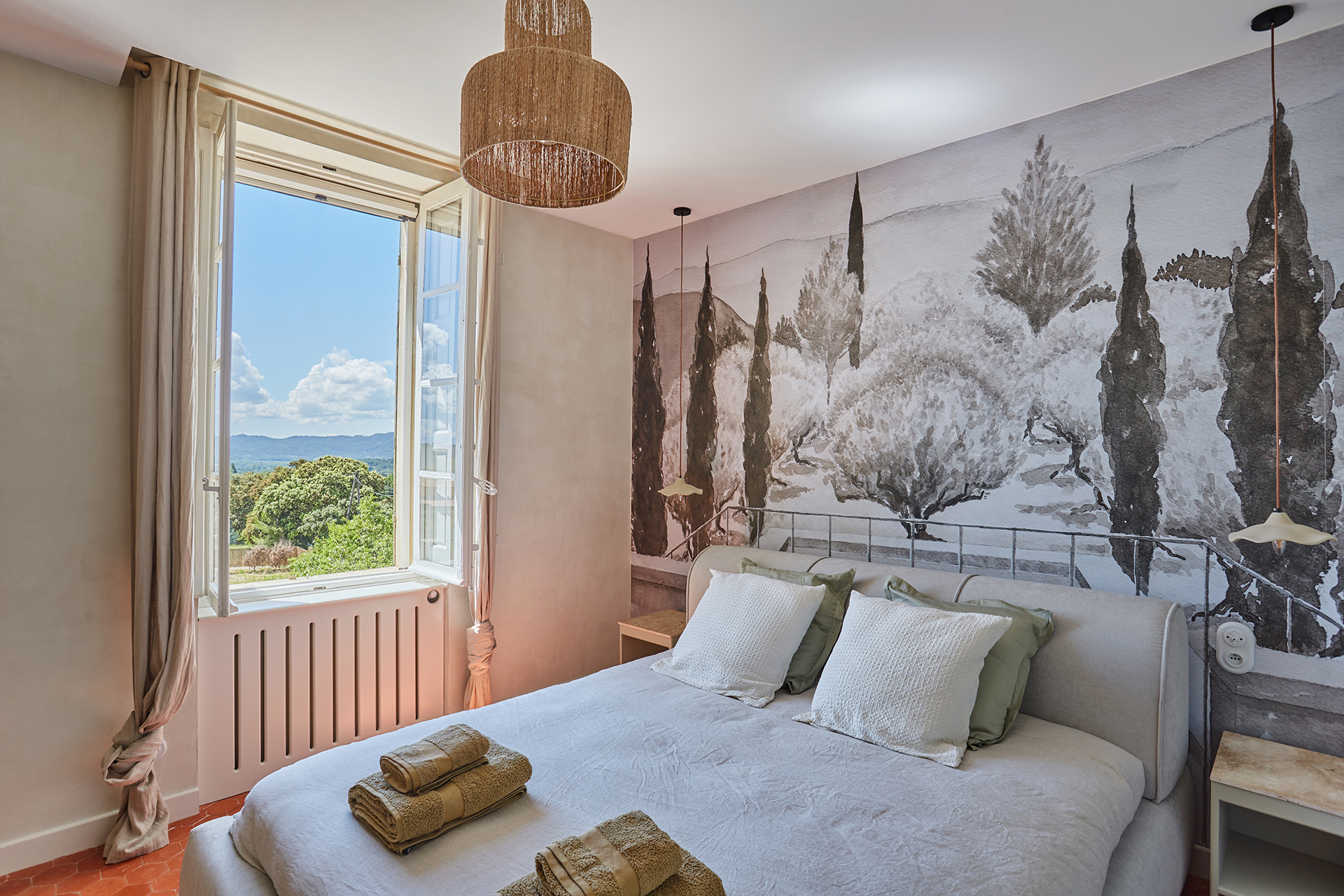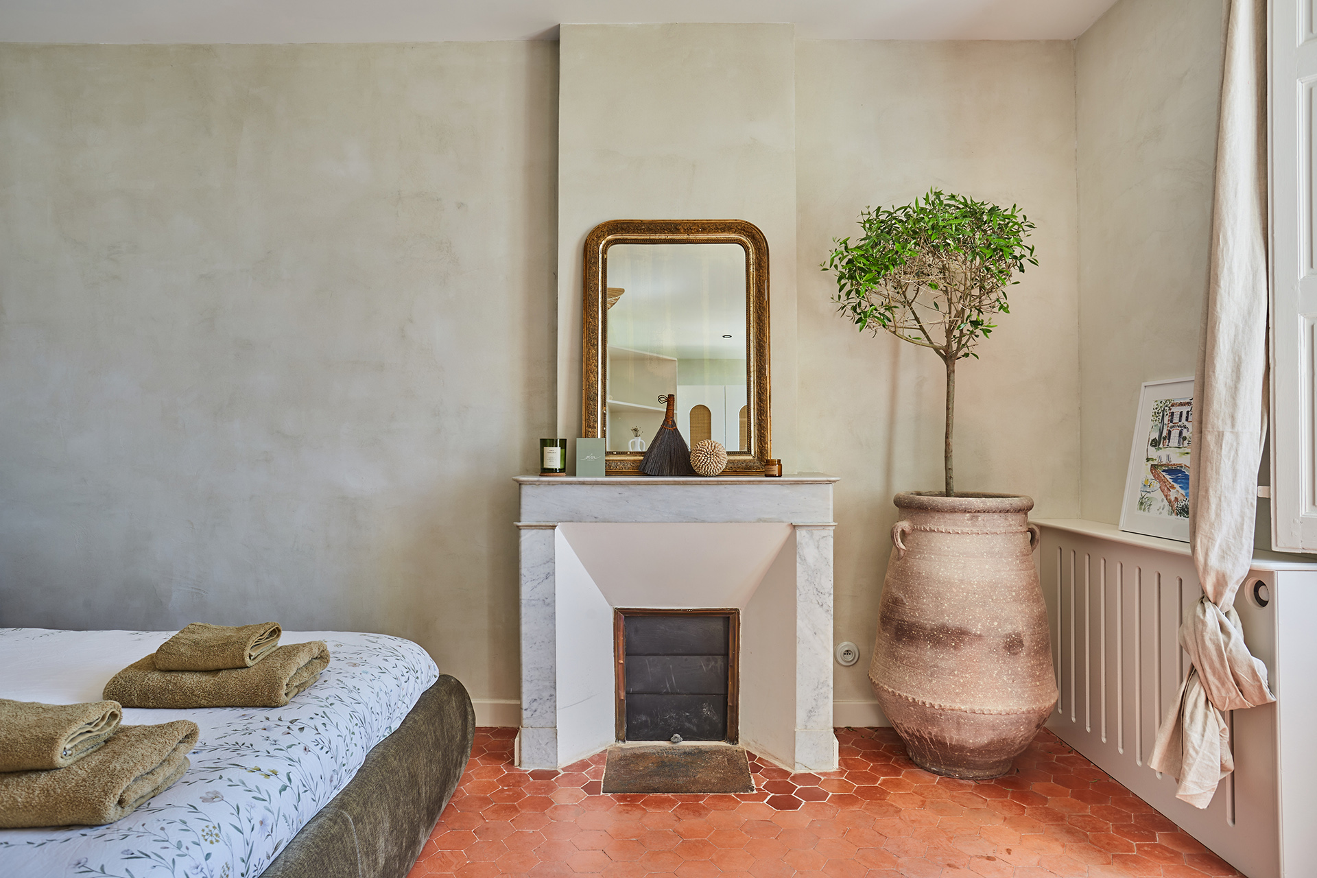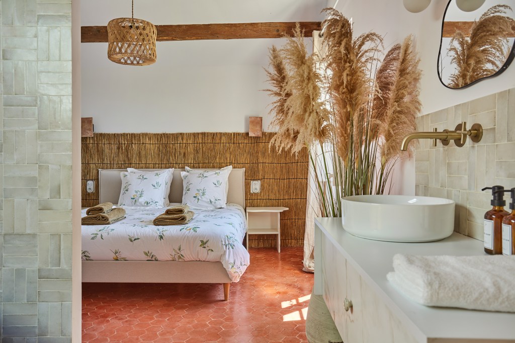 Les chambres, simples et poétiques, conservent l’esprit authentique de la maison. Les poutres apparentes ont été restaurées par sablage, et le bois naturel a été traité pour mettre en valeur sa texture. La tête de lit, réalisée en paille tressée, apporte une touche artisanale à la pièce. Les murs, badigeonnés à la chaux couleur sable clair, créent une ambiance douce et chaleureuse. Les penderies en bois, réalisées sur mesure, possèdent des ouvertures centrales arquées, et les radiateurs ont été dissimulés derrière des plaques en bois ajouré.
