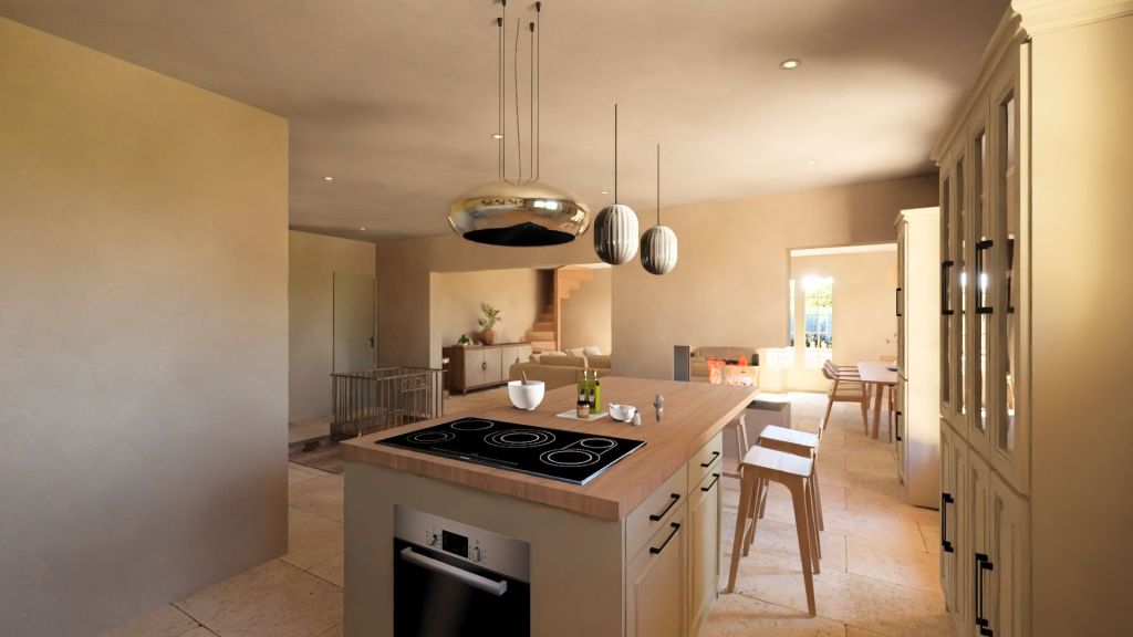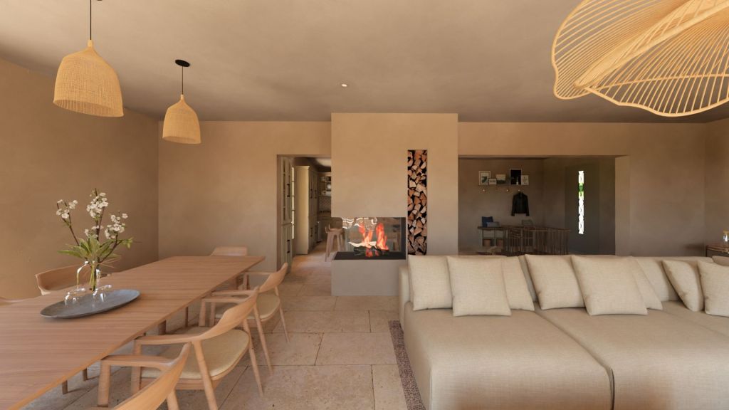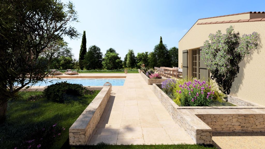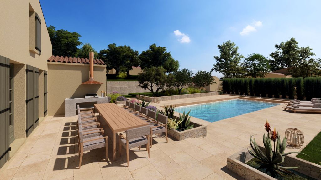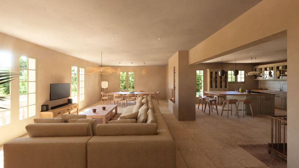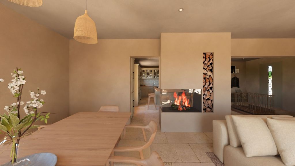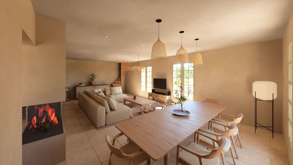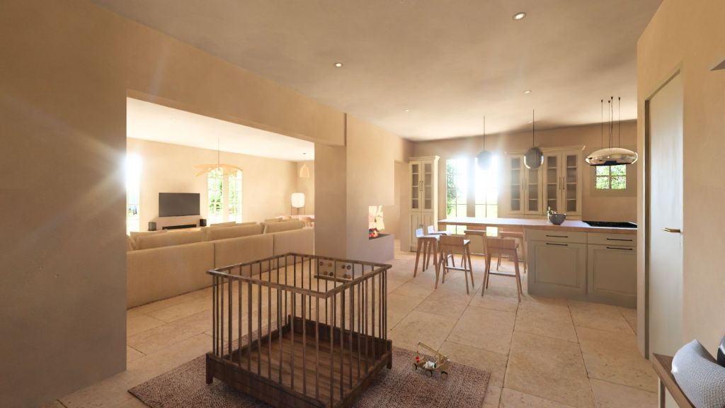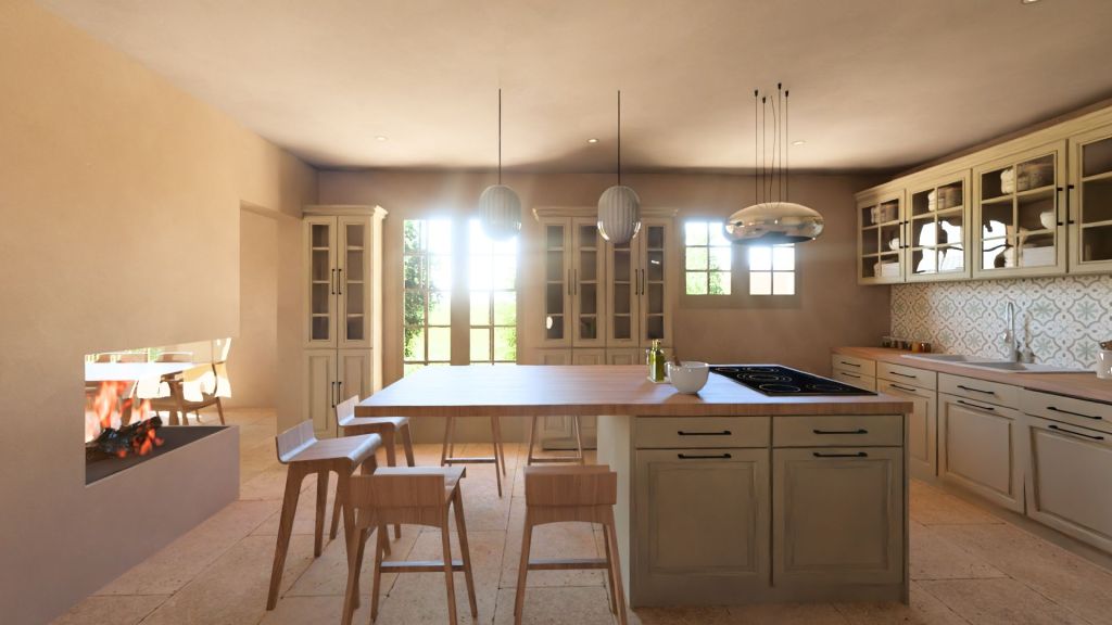 Projet d’extension d’une villa à Joucas, dans le massif du Luberon, aux abords de Gordes, dans un secteur viticole. La maison se situe dans un secteur sauvegardé, ce qui implique une collaboration avec les Architectes des Bâtiments de France. La piscine est accompagnée d’une terrasse équipée d’un barbecue. Le montant total des travaux est estimé à 320 000 €. Les menuiseries sont en bois, avec des petits bois mortaisés, et les volets sont traditionnels à lames verticales. L’ensemble de ces éléments est teinté en vert olive, une couleur inspirée des oliviers environnants. L’intérieur de la maison comprend une cheminée centrale de style moderne, permettant de placer le foyer au cœur de l’habitation. Le style général est à la fois traditionnel et provençal.