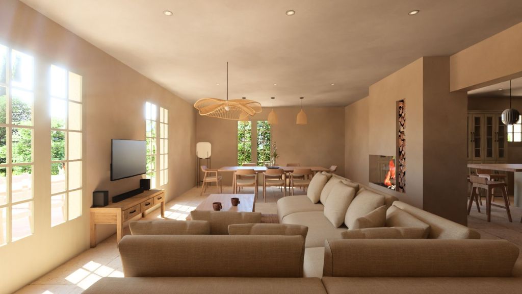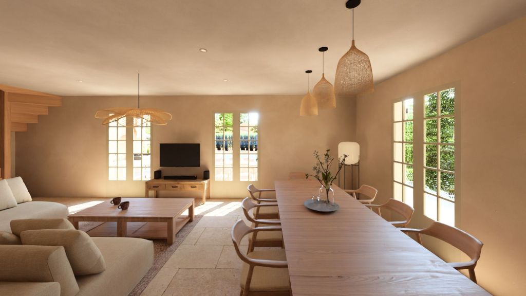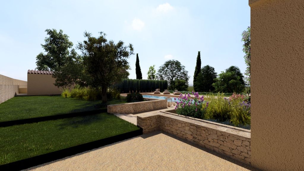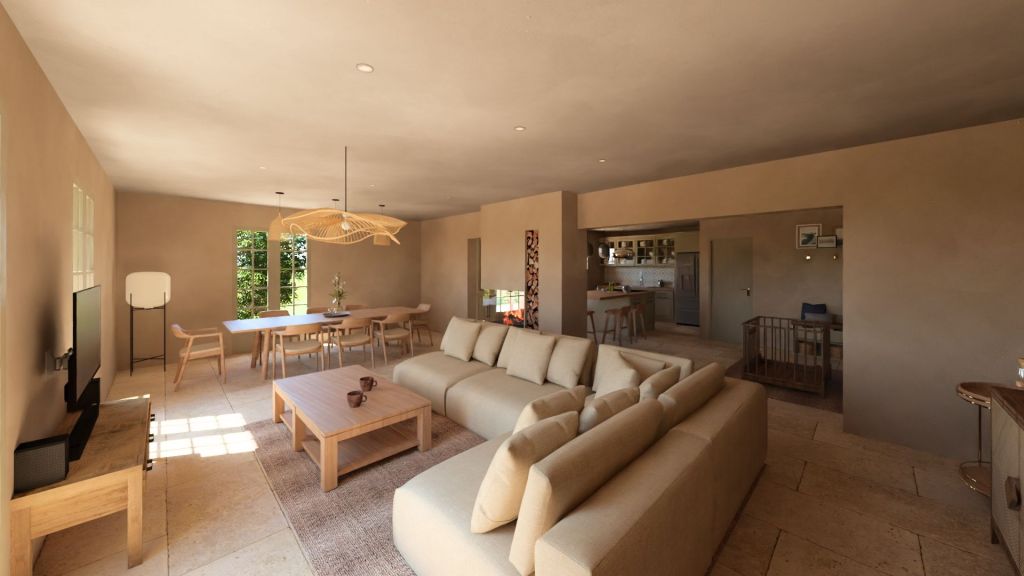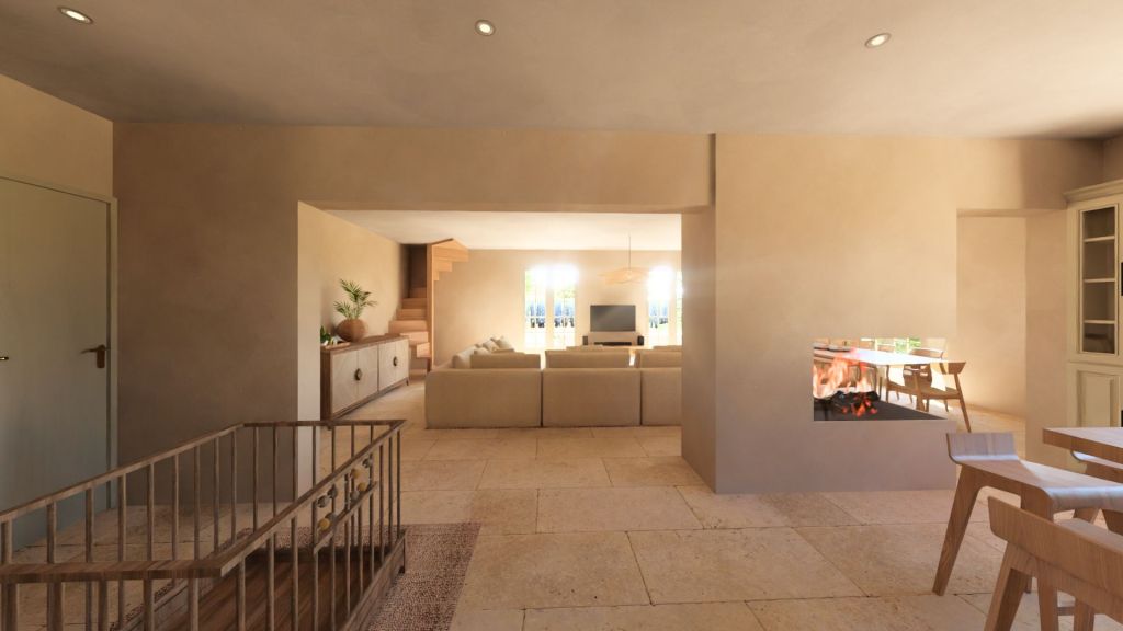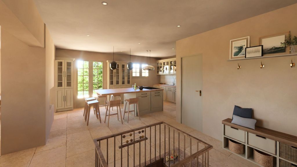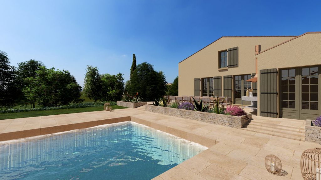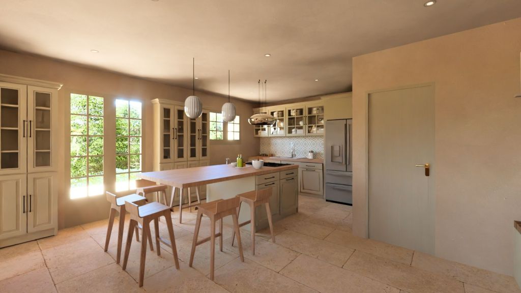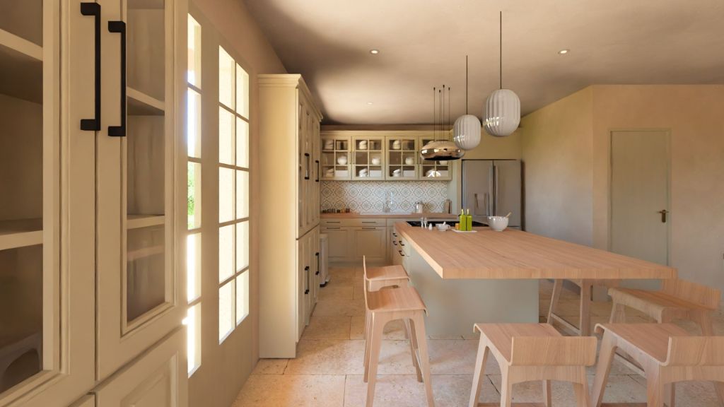 Projet d’extension d’une villa à Joucas, dans le massif du Luberon, aux abords de Gordes, dans un secteur viticole. La maison se situe dans un secteur sauvegardé, ce qui implique une collaboration avec les Architectes des Bâtiments de France. La piscine est accompagnée d’une terrasse équipée d’un barbecue. Le montant total des travaux est estimé à 320 000 €. Les menuiseries sont en bois, avec des petits bois mortaisés, et les volets sont traditionnels à lames verticales. L’ensemble de ces éléments est teinté en vert olive, une couleur inspirée des oliviers environnants. L’intérieur de la maison comprend une cheminée centrale de style moderne, permettant de placer le foyer au cœur de l’habitation. Le style général est à la fois traditionnel et provençal.