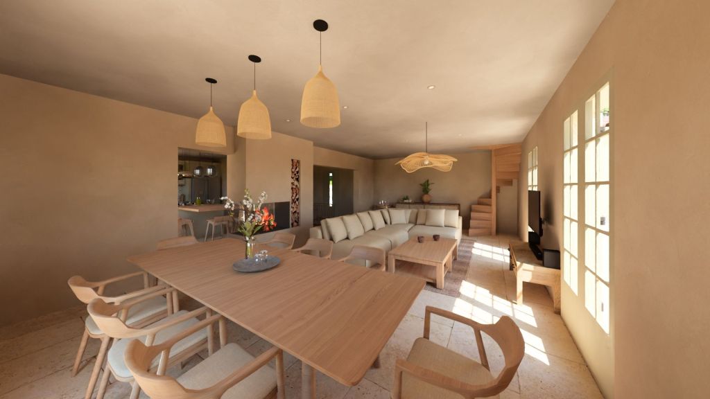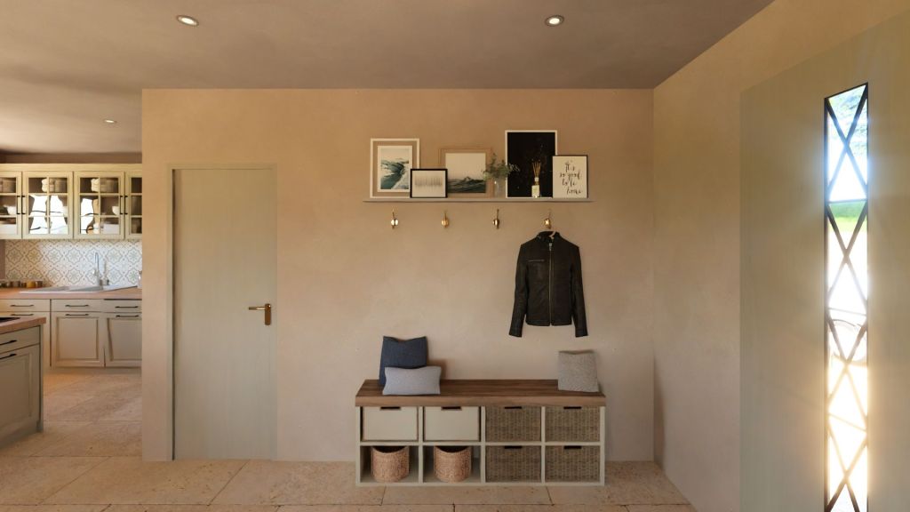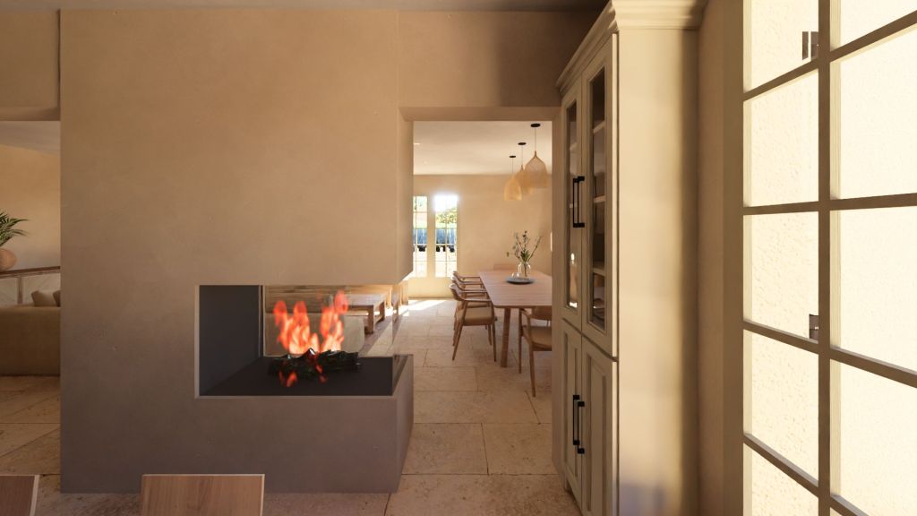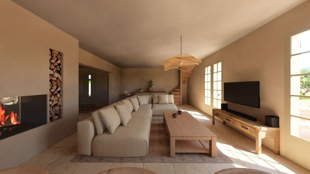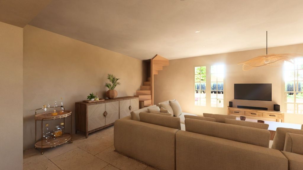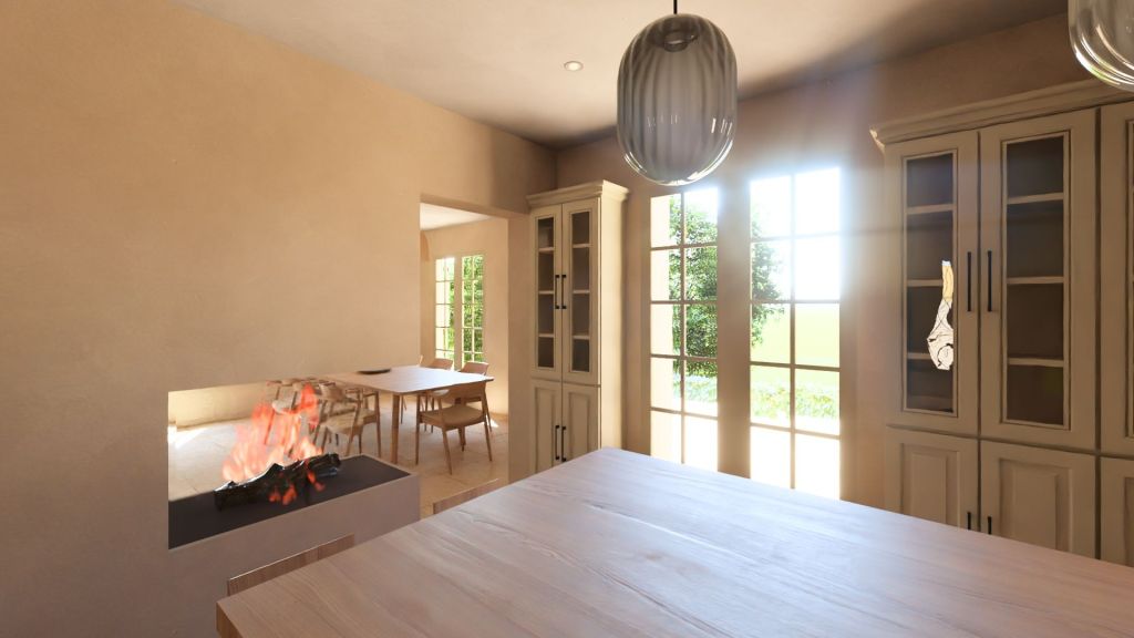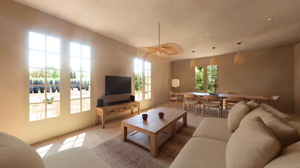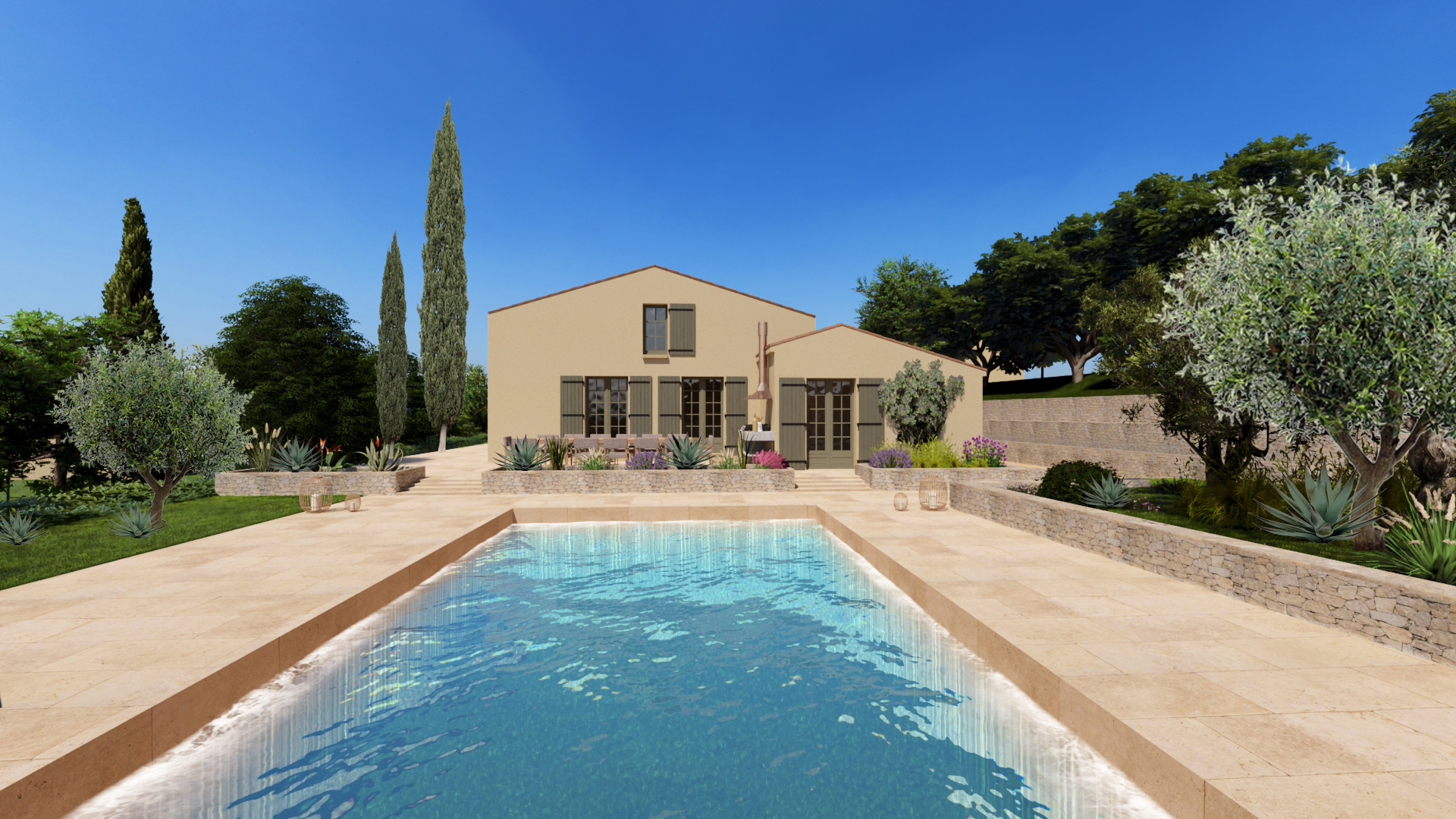 Projet d’extension d’une villa à Joucas, dans le massif du Luberon, aux abords de Gordes, dans un secteur viticole. La maison se situe dans un secteur sauvegardé, ce qui implique une collaboration avec les Architectes des Bâtiments de France. La piscine est accompagnée d’une terrasse équipée d’un barbecue. Le montant total des travaux est estimé à 320 000 €. Les menuiseries sont en bois, avec des petits bois mortaisés, et les volets sont traditionnels à lames verticales. L’ensemble de ces éléments est teinté en vert olive, une couleur inspirée des oliviers environnants. L’intérieur de la maison comprend une cheminée centrale de style moderne, permettant de placer le foyer au cœur de l’habitation. Le style général est à la fois traditionnel et provençal.