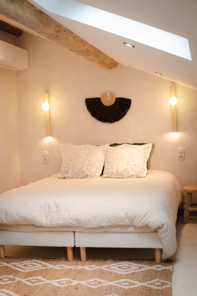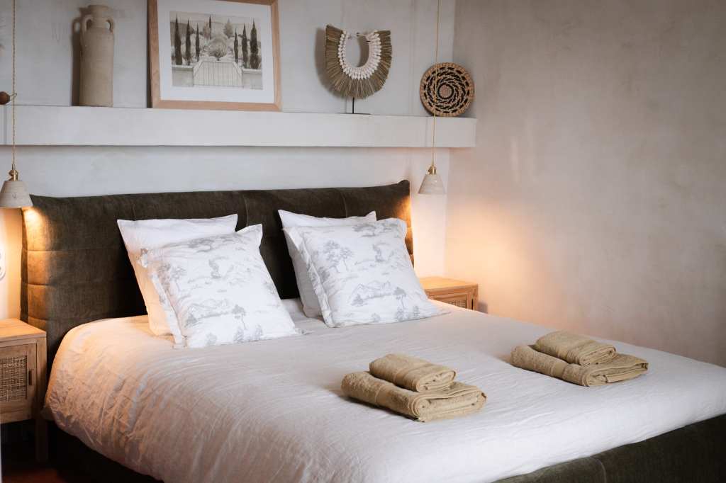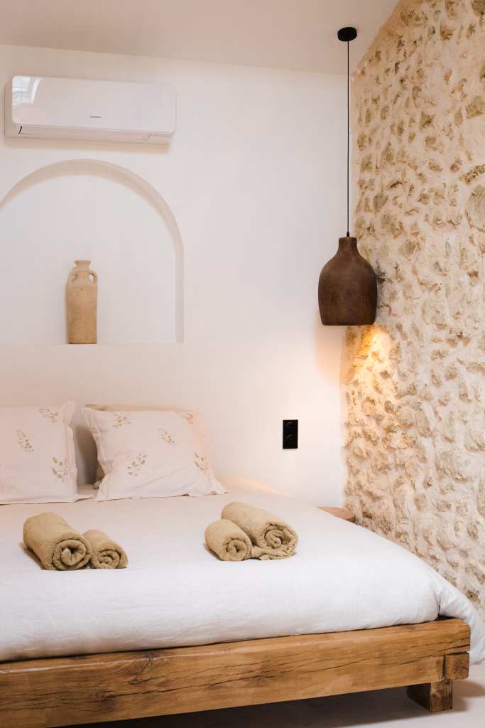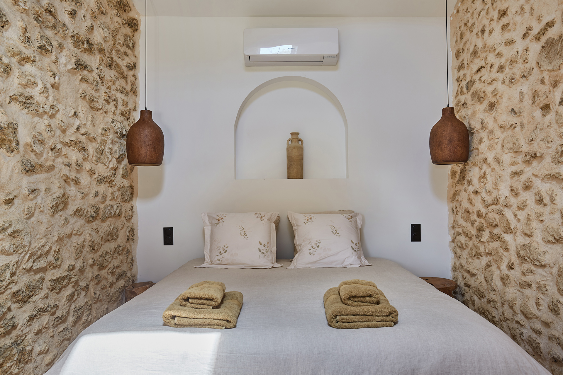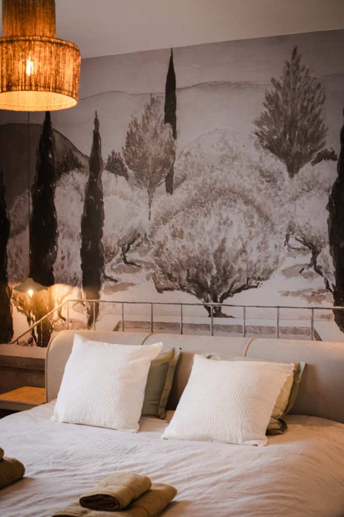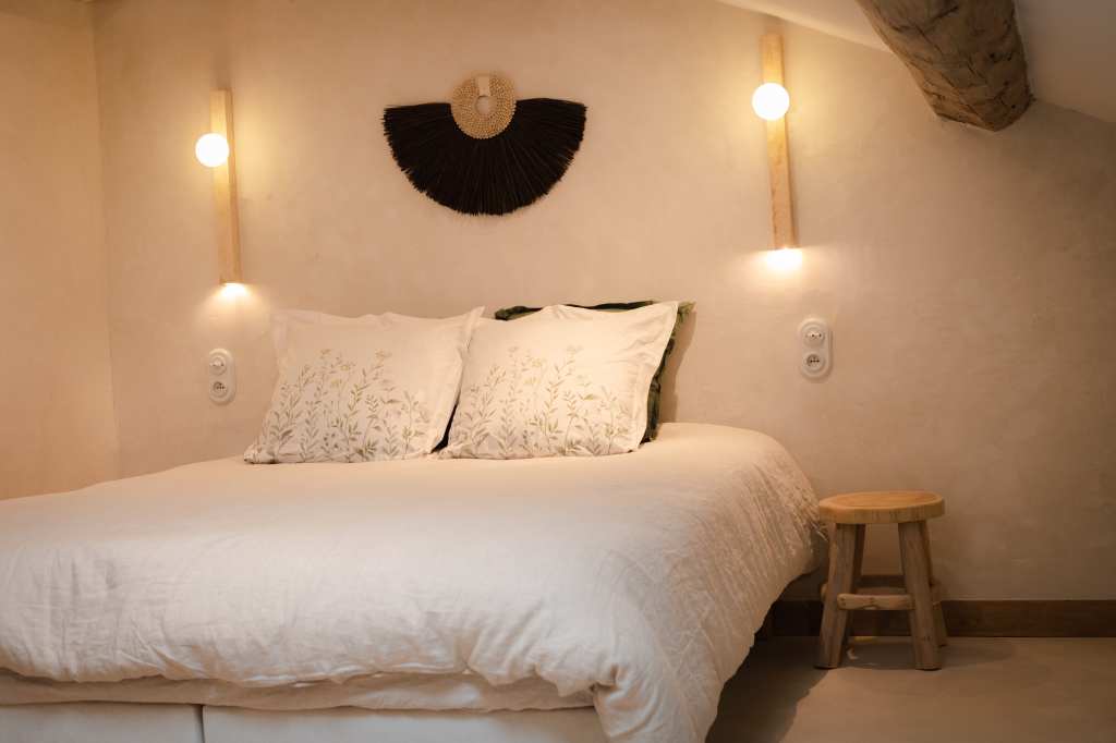 Cette partie, entièrement en ruine, a été intégralement restaurée pour créer une chambre. Une niche arquée accueille une jarre en argile, tandis que les murs sont badigeonnés à la chaux. Des »saignées » ont été réalisées dans le mur existant pour dissimuler le système d’éclairage et installer deux interrupteurs de part et d’autre du lit double. Enfin, une tapisserie représentant des oliviers et des cyprès d’Italie a été réalisée sous forme d’aquarelle géante, habillant la tête de lit.