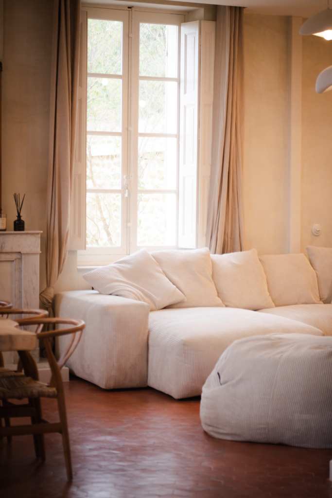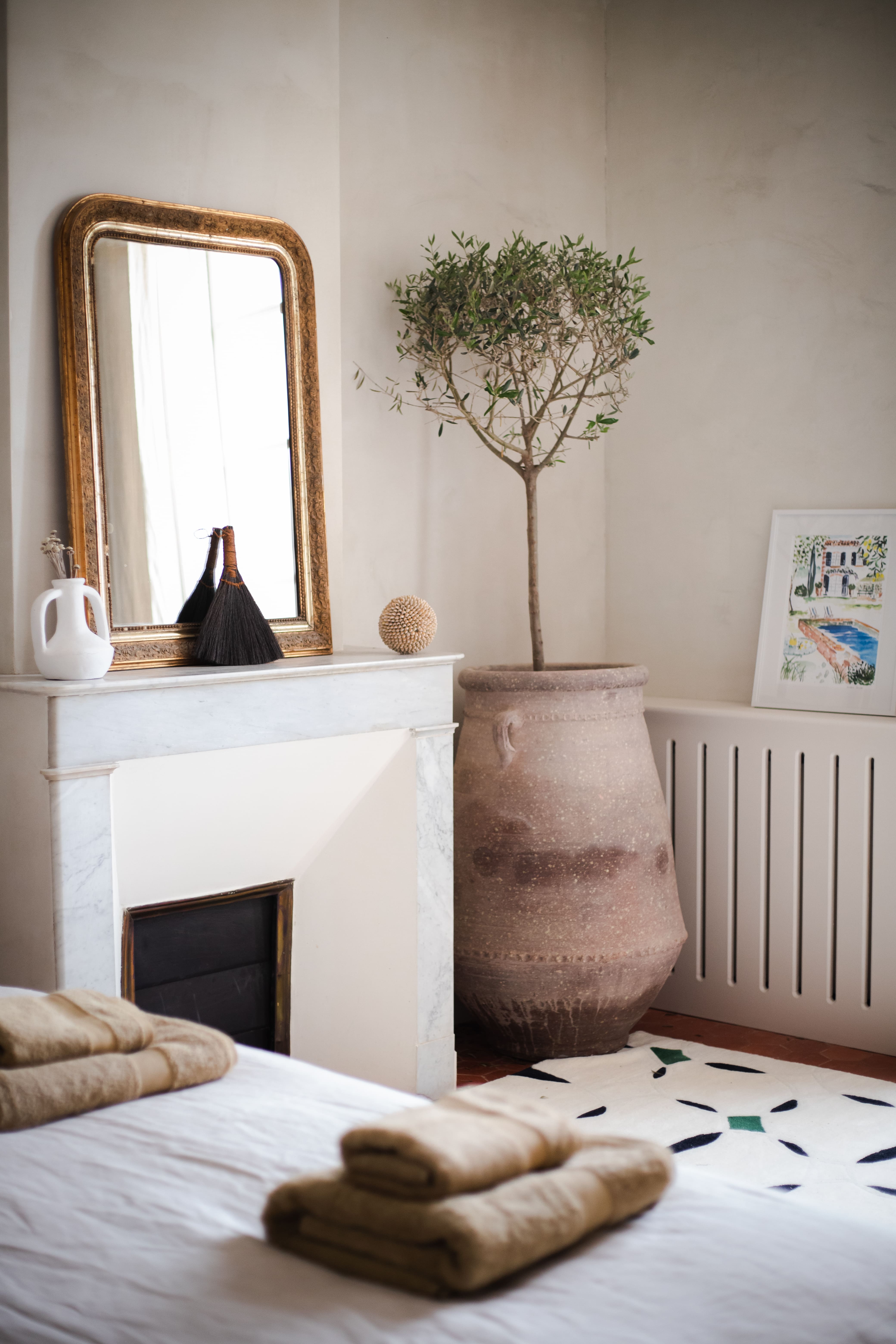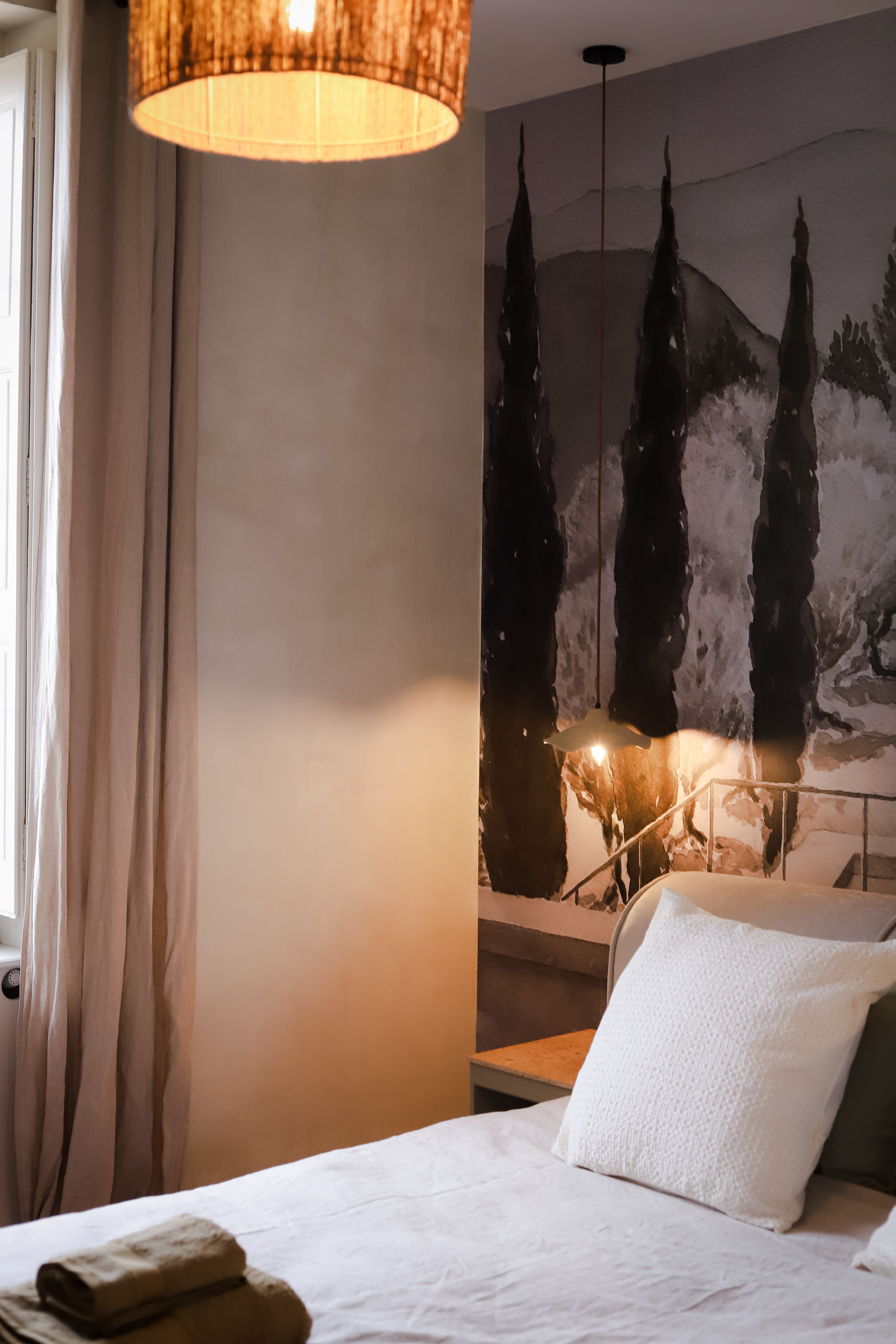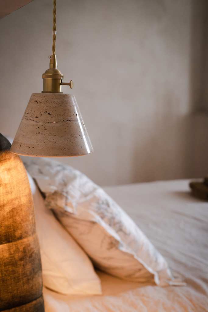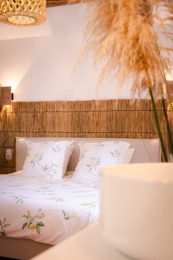 Cette partie, entièrement en ruine, a été intégralement restaurée pour créer une chambre. Une niche arquée accueille une jarre en argile, tandis que les murs sont badigeonnés à la chaux. Des »saignées » ont été réalisées dans le mur existant pour dissimuler le système d’éclairage et installer deux interrupteurs de part et d’autre du lit double. Enfin, une tapisserie représentant des oliviers et des cyprès d’Italie a été réalisée sous forme d’aquarelle géante, habillant la tête de lit.