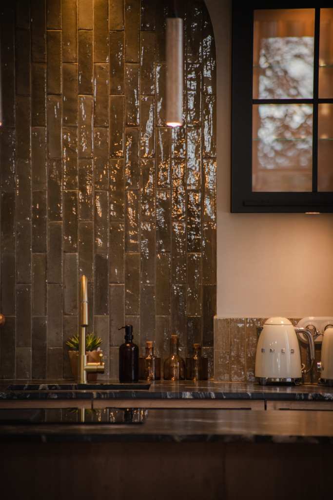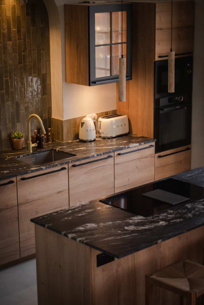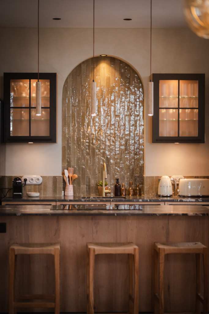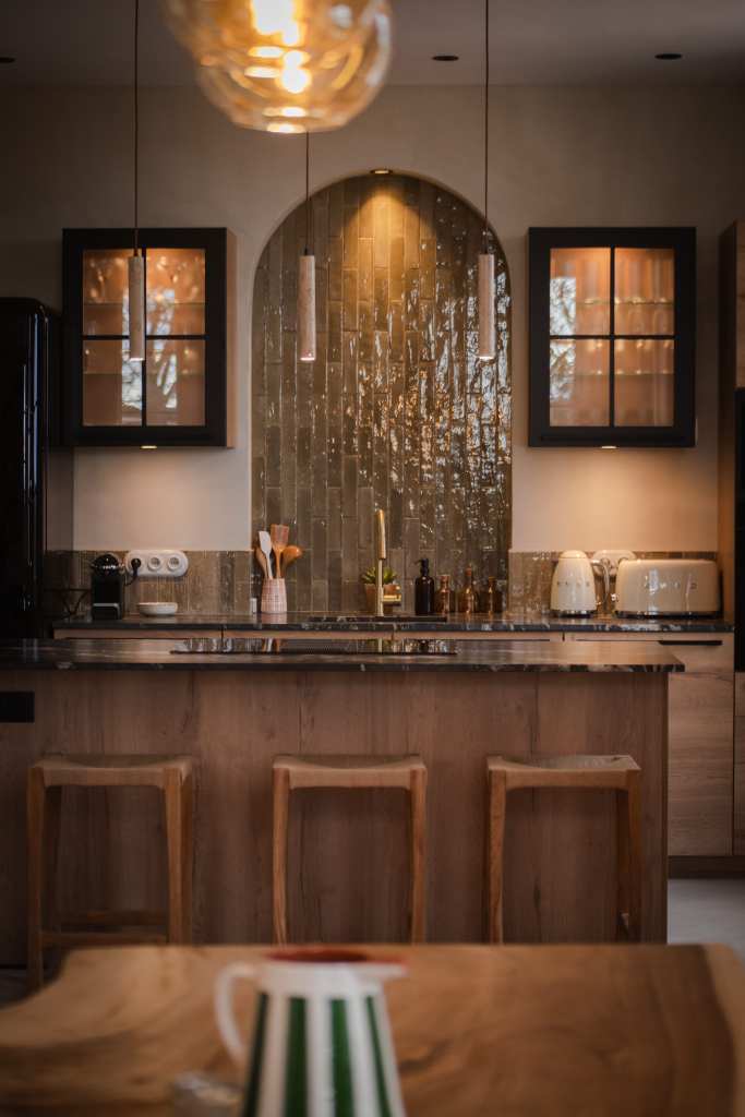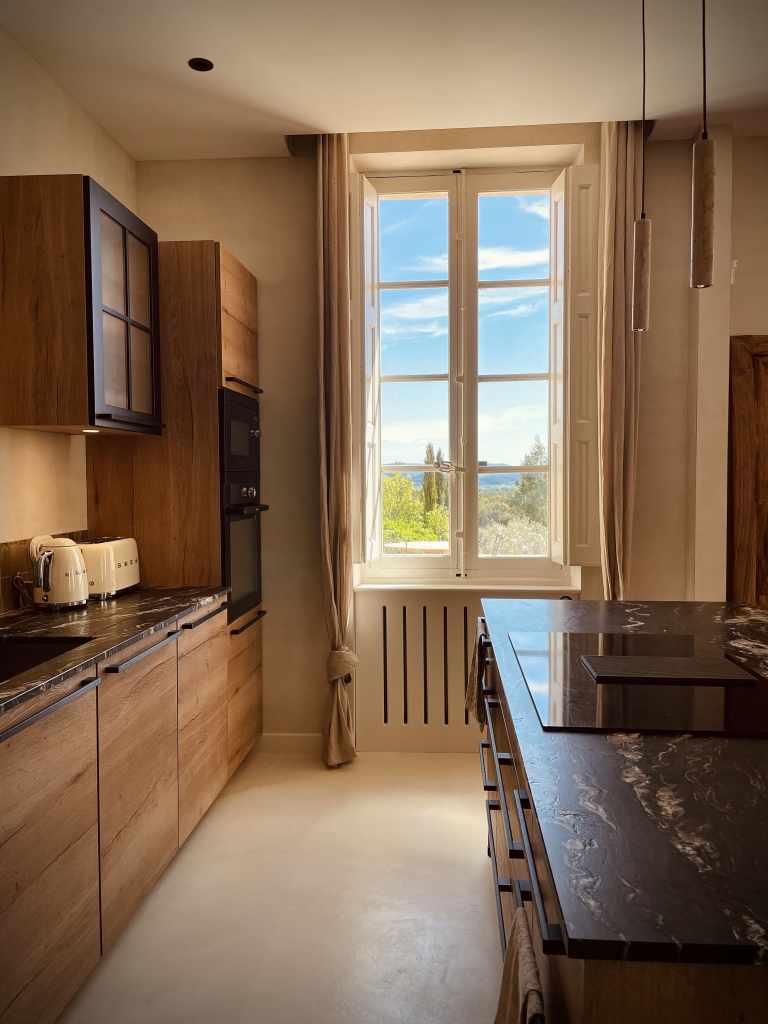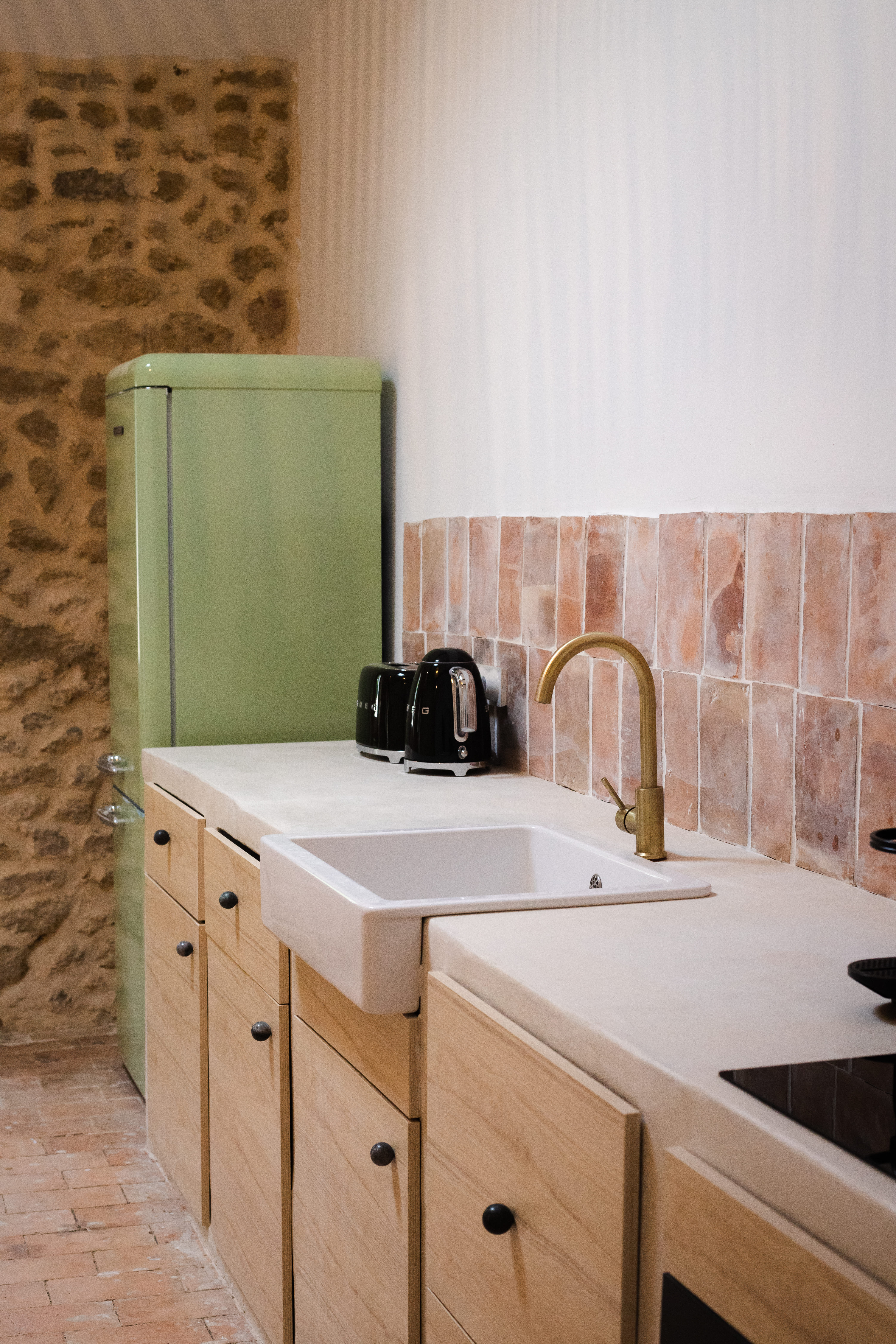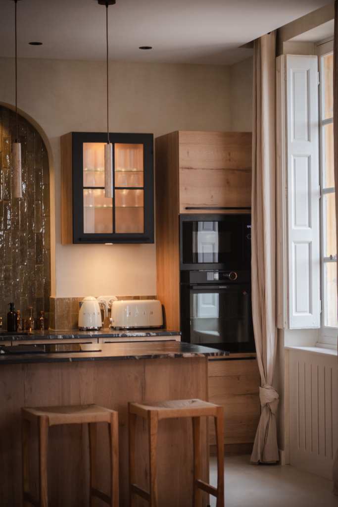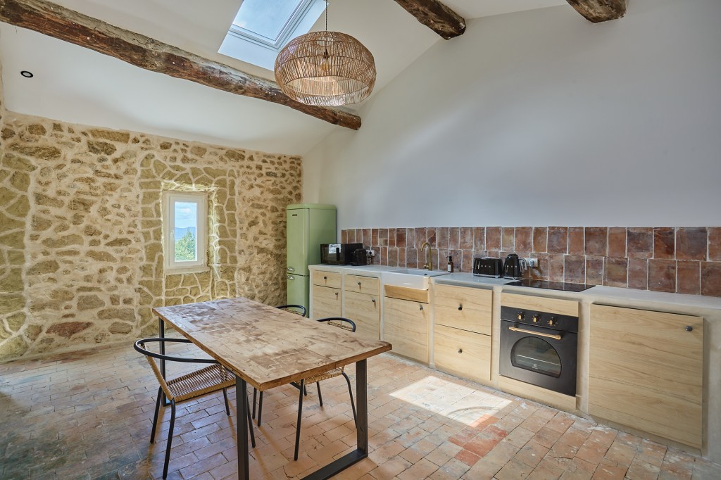 Une cuisine simple et équilibrée a été conçue en mettant en valeur les matériaux bruts. Le sol en terre cuite d’origine a été conservé, tout comme les poutres en chêne, sablées et traitées pour en révéler la teinte naturelle. Les pare-feuilles d’origines, récupérés en sous-face de la toiture, ont été réutilisés pour la crédence, apportant une touche irrégulière grâce à leur fabrication artisanale.