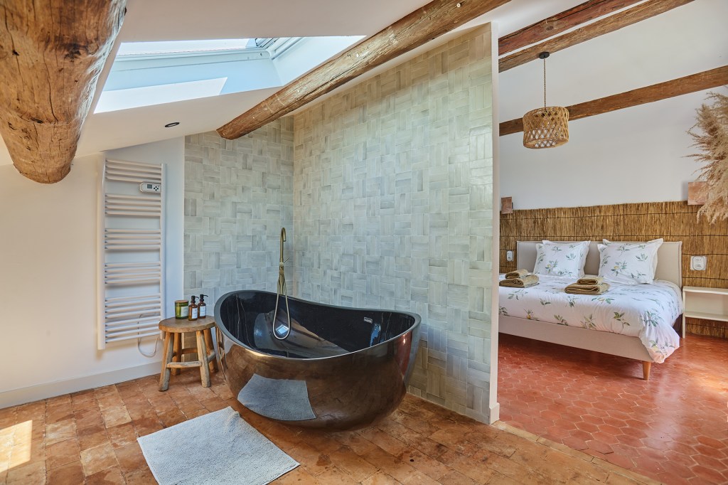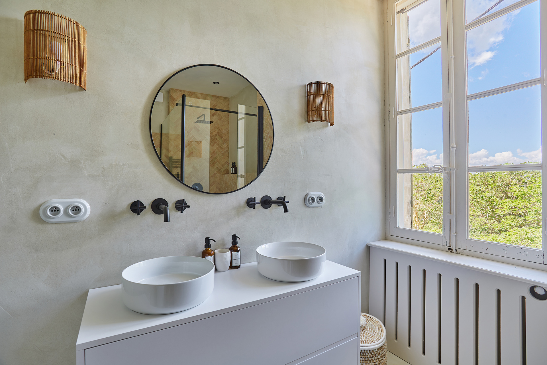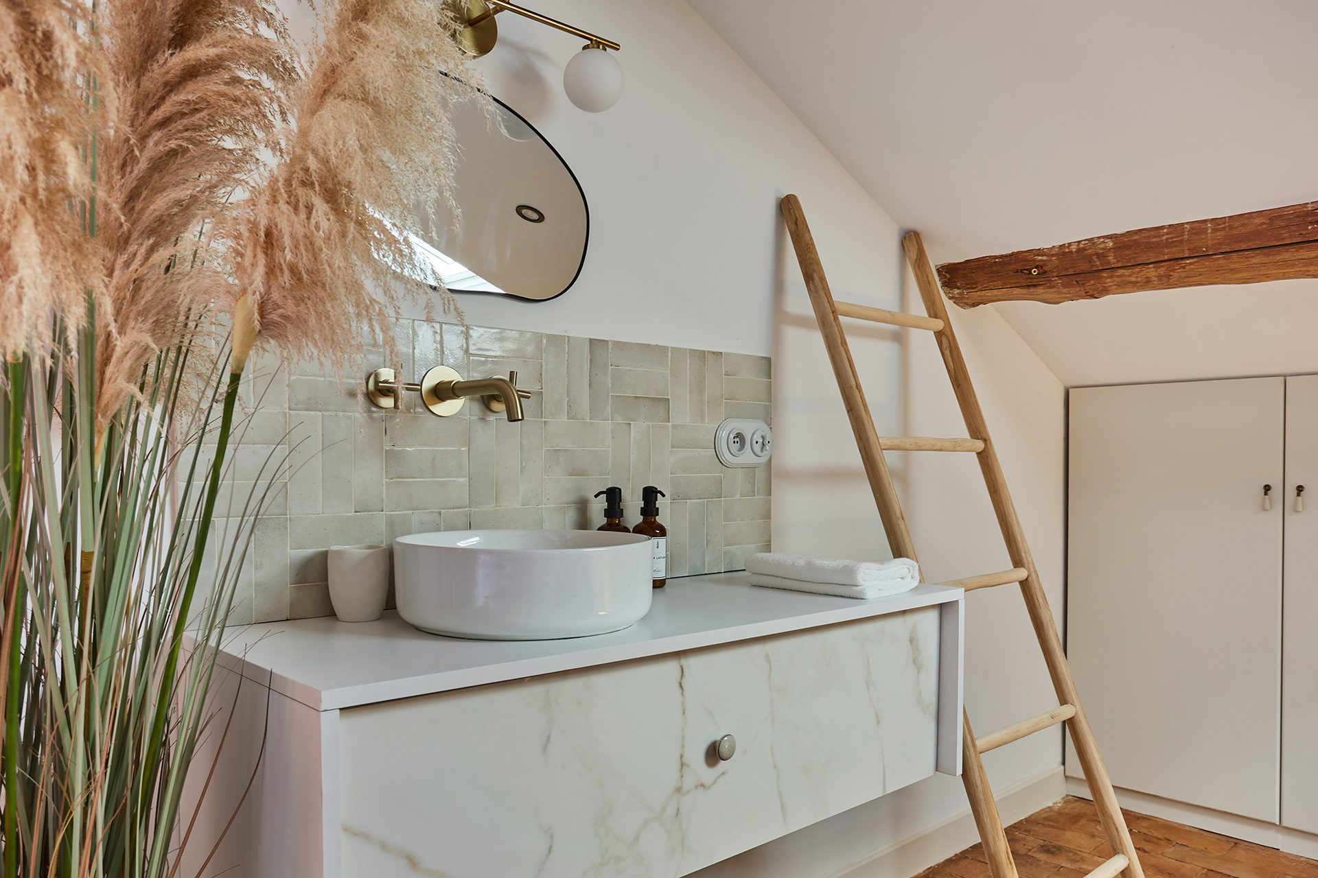 La salle d’eau s’inspire du style traditionnel provençal. Le carrelage en zellige vert olive, avec des joints blancs, crée un jeu de couleurs rafraîchissant. Les murs, peints dans une teinte de chaud vert très clair, apportent une atmosphère apaisante. Les robinetteries en cuivre, ainsi que la douche et les luminaires métalliques, ajoutent du caractère à l’espace. Deux doubles vasques ont été installées, avec des miroirs sinueux au-dessus, accentuant le côté organique de la pièce.