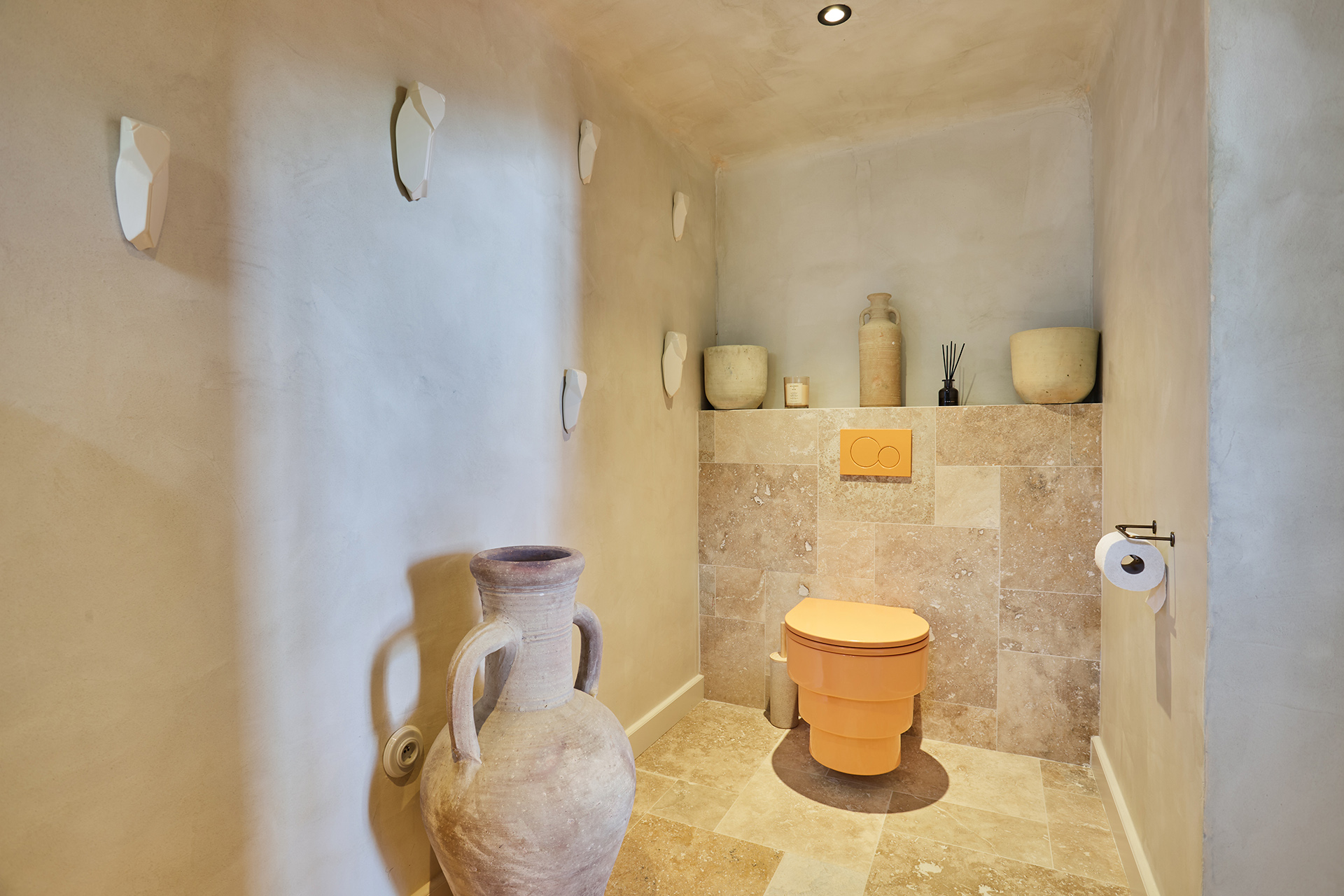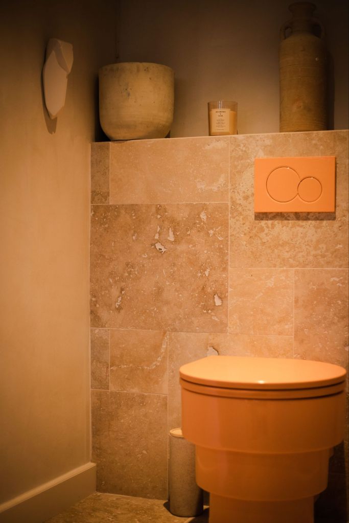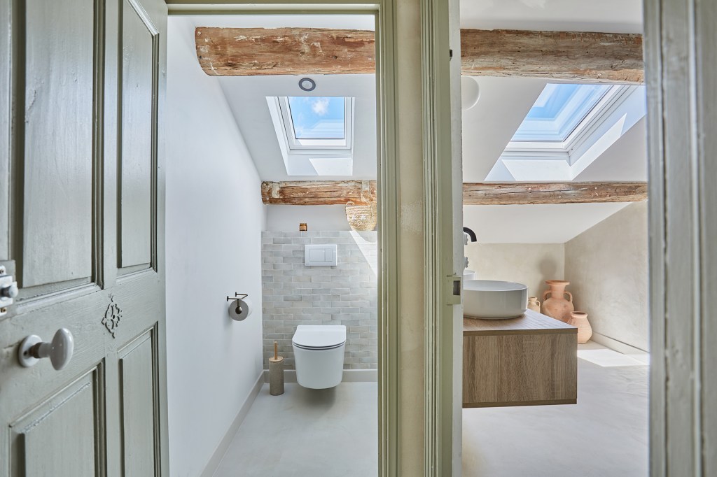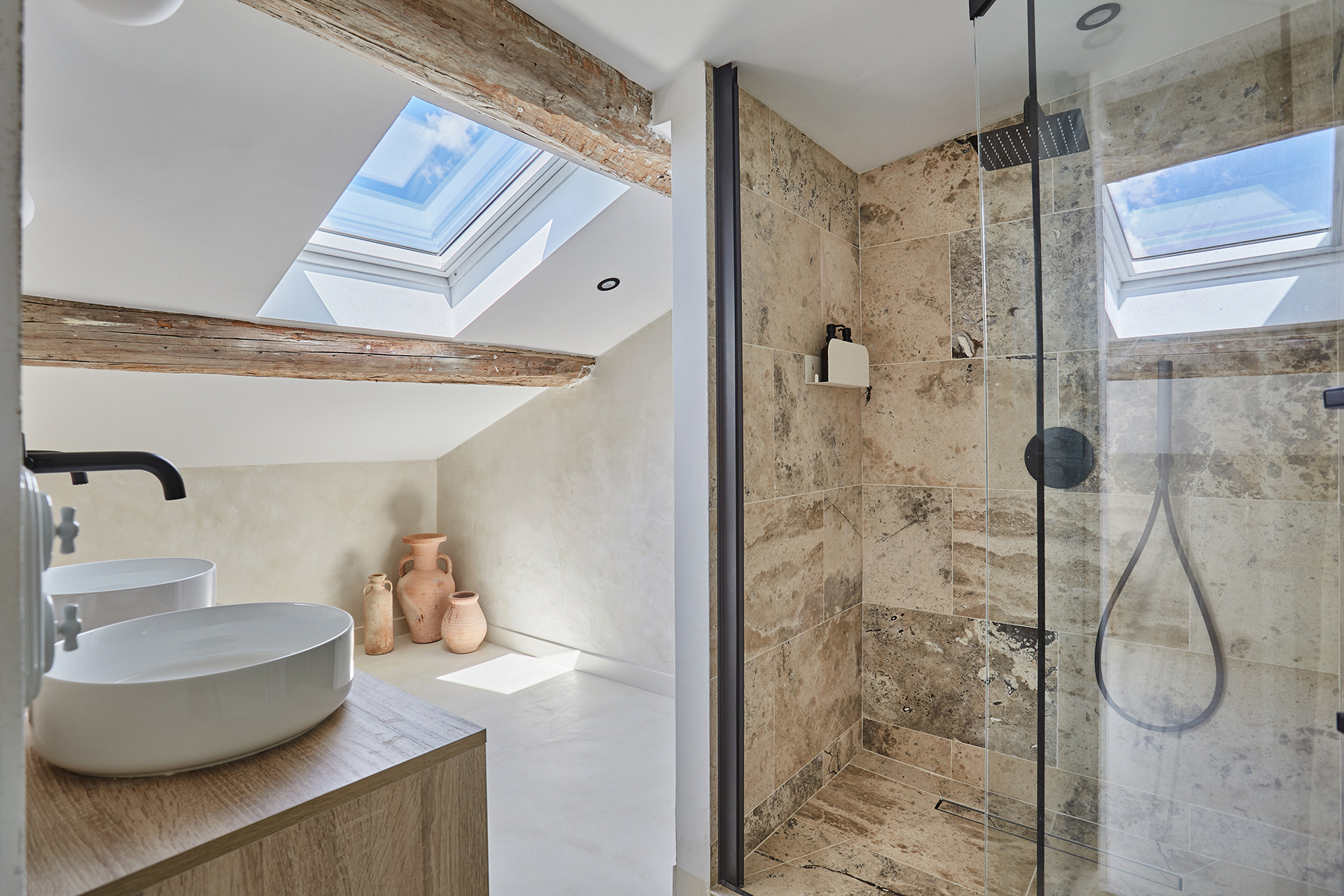 La salle d’eau s’inspire du style traditionnel provençal. Le carrelage en zellige vert olive, avec des joints blancs, crée un jeu de couleurs rafraîchissant. Les murs, peints dans une teinte de chaud vert très clair, apportent une atmosphère apaisante. Les robinetteries en cuivre, ainsi que la douche et les luminaires métalliques, ajoutent du caractère à l’espace. Deux doubles vasques ont été installées, avec des miroirs sinueux au-dessus, accentuant le côté organique de la pièce.