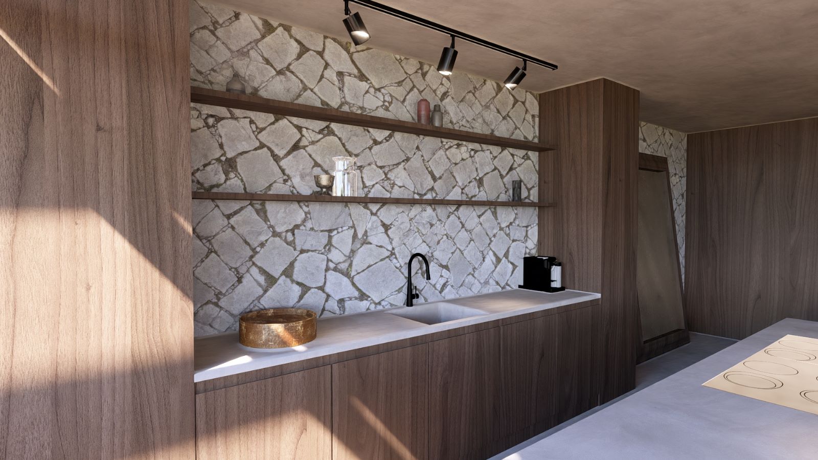 Ce projet se distingue par son esthétique sobre, inspirée des éléments naturels. Les matériaux nobles tels que le bois massif de noyer, les pierres calcaires sèches évoquant les sentiers de Marcel Pagnol, et les matériaux bruts sont harmonieusement intégrés.