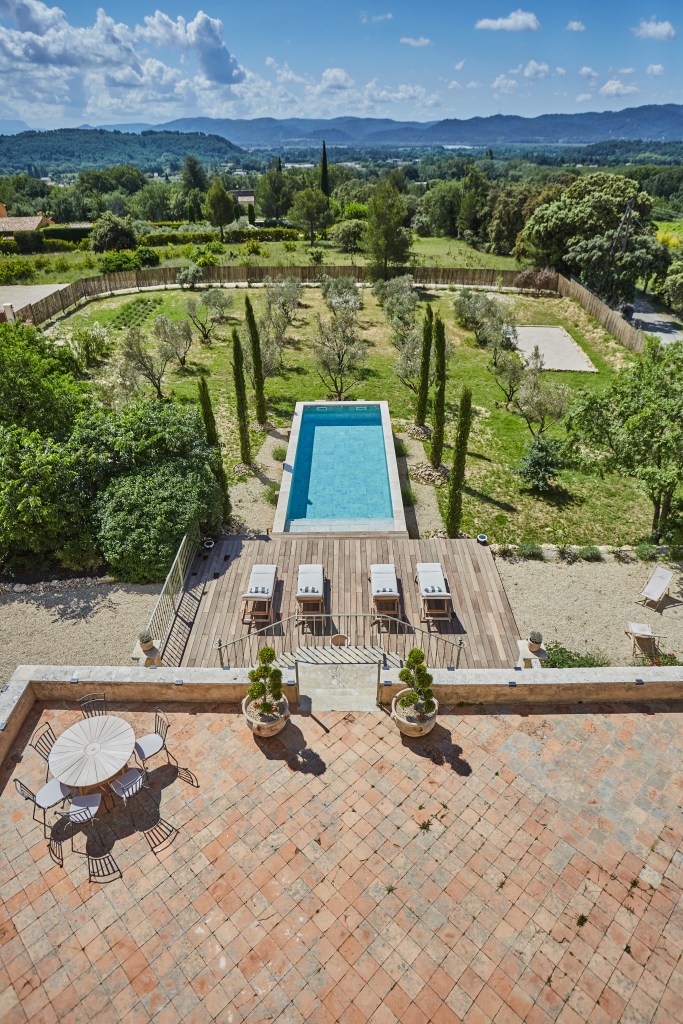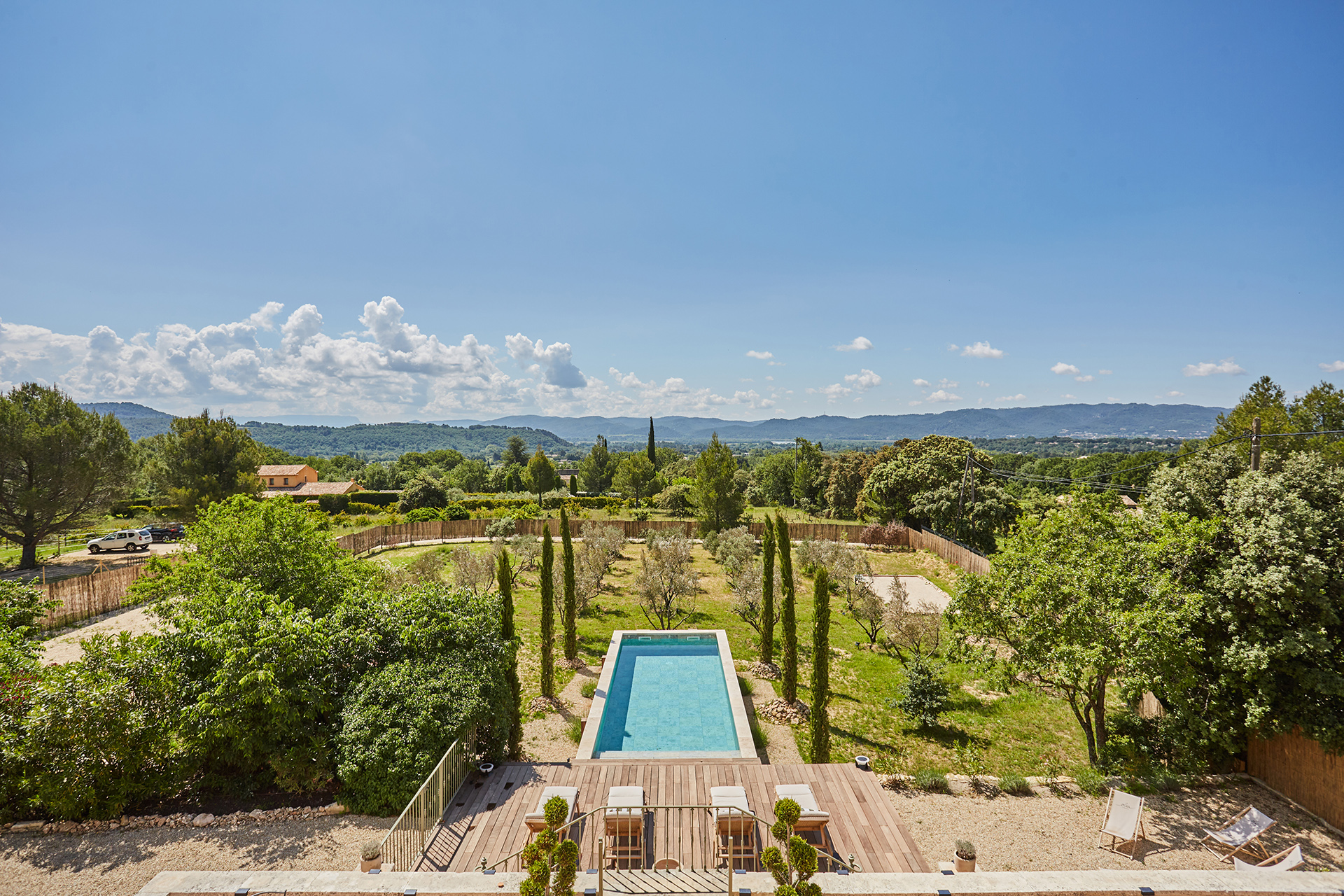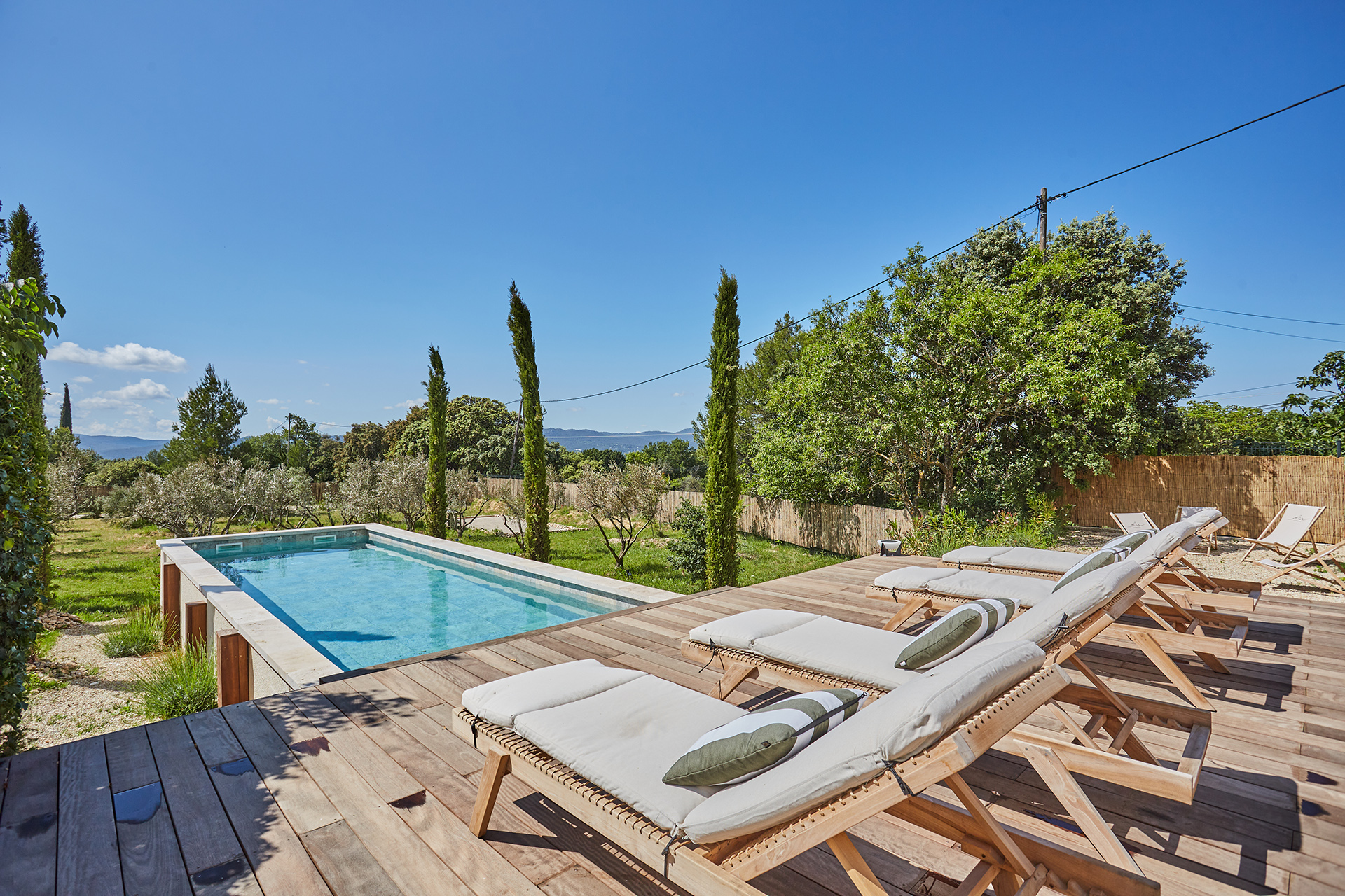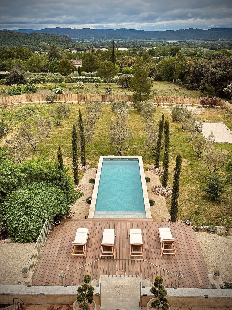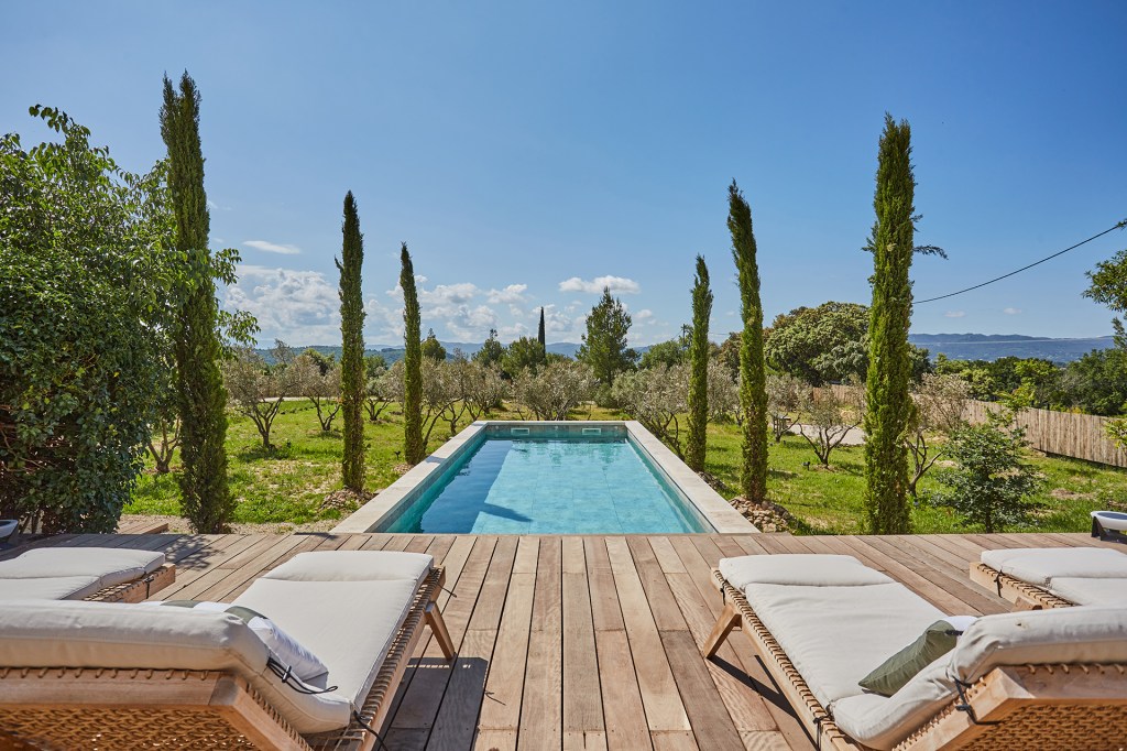 Le bassin, semi-enterré, est conçu avec des matériaux en pierre, dont principalement du granit pour les revêtements. Une terrasse en bois démontable est installée au-dessus du réseau enterré. Des cyprès d’Italie et des oliviers sont plantés dans le jardin, créant ainsi une ambiance méditerranéenne.