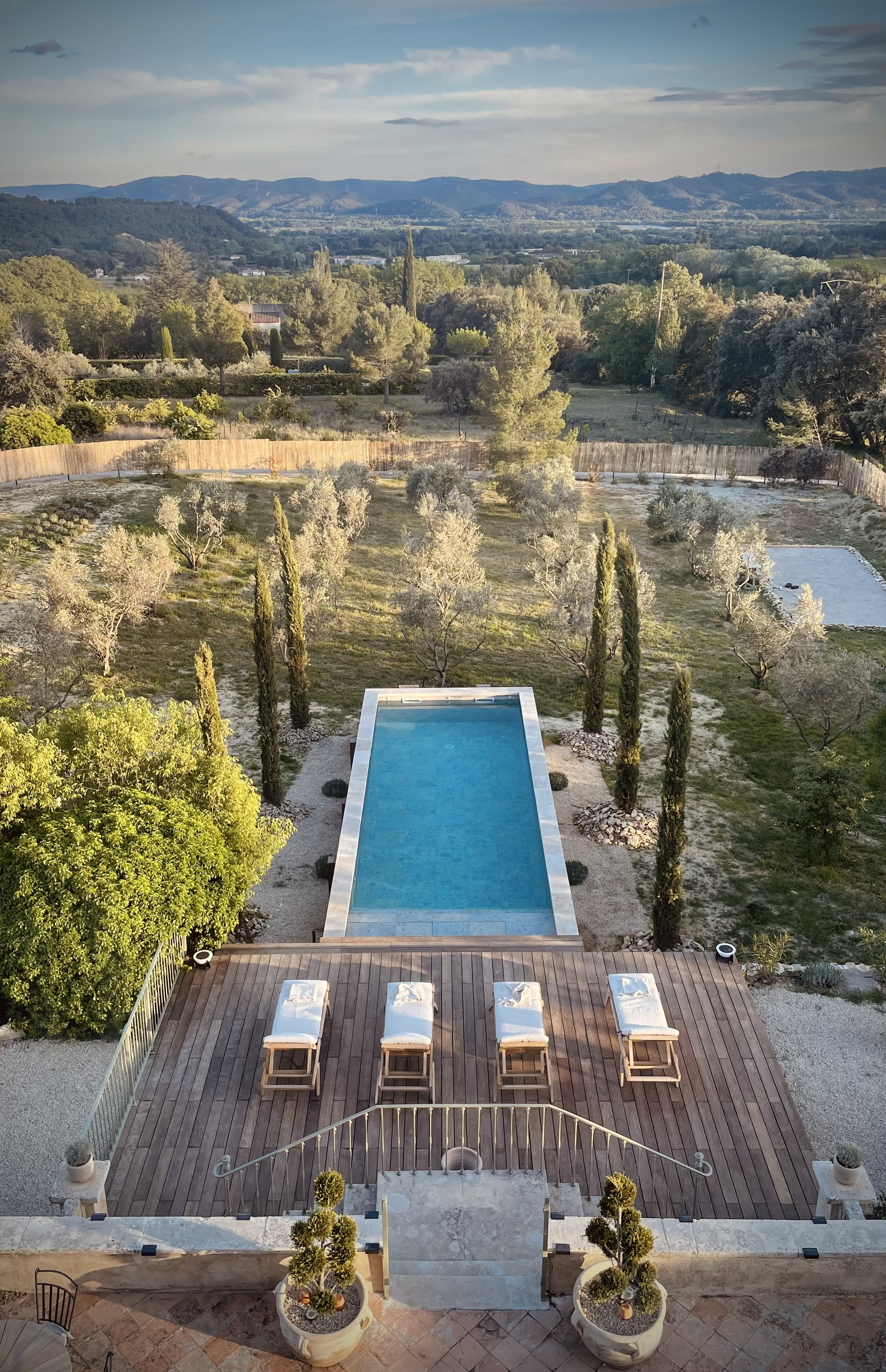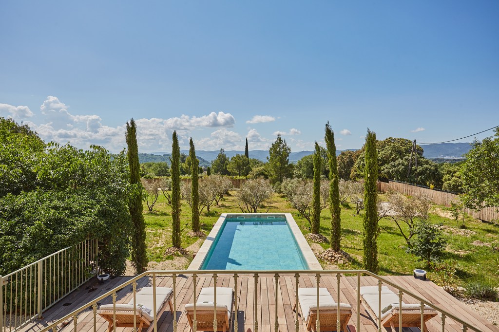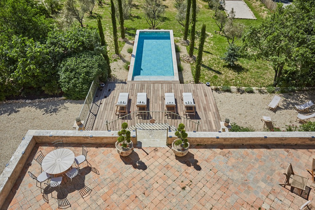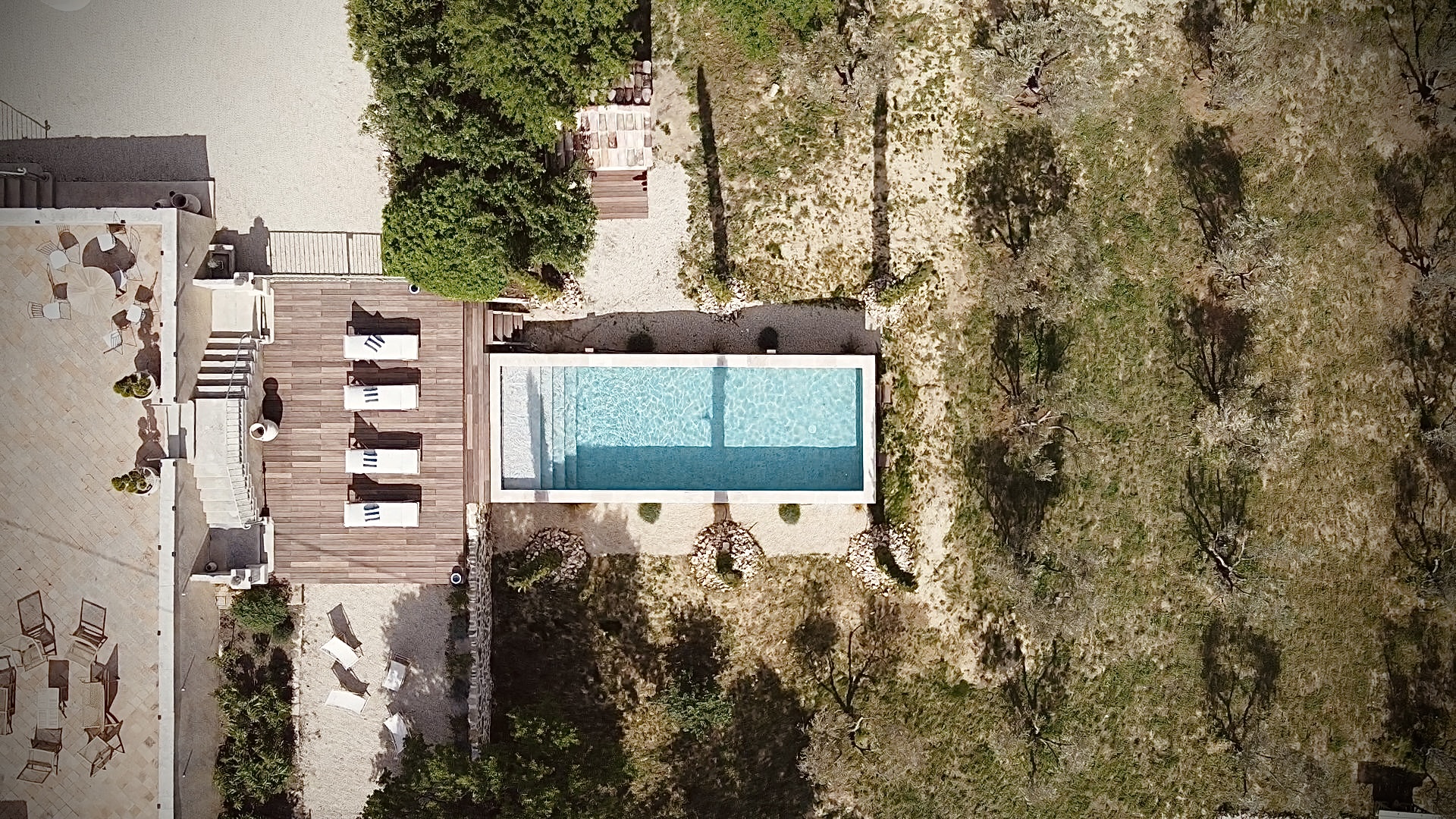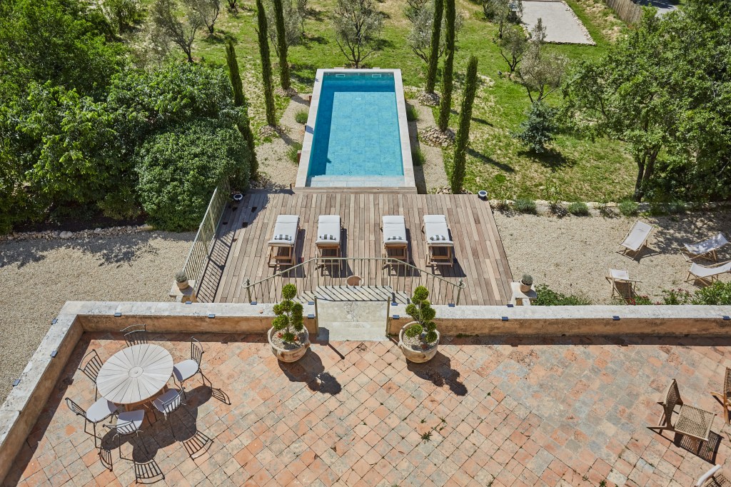 Le bassin, semi-enterré, est conçu avec des matériaux en pierre, dont principalement du granit pour les revêtements. Une terrasse en bois démontable est installée au-dessus du réseau enterré. Des cyprès d’Italie et des oliviers sont plantés dans le jardin, créant ainsi une ambiance méditerranéenne.