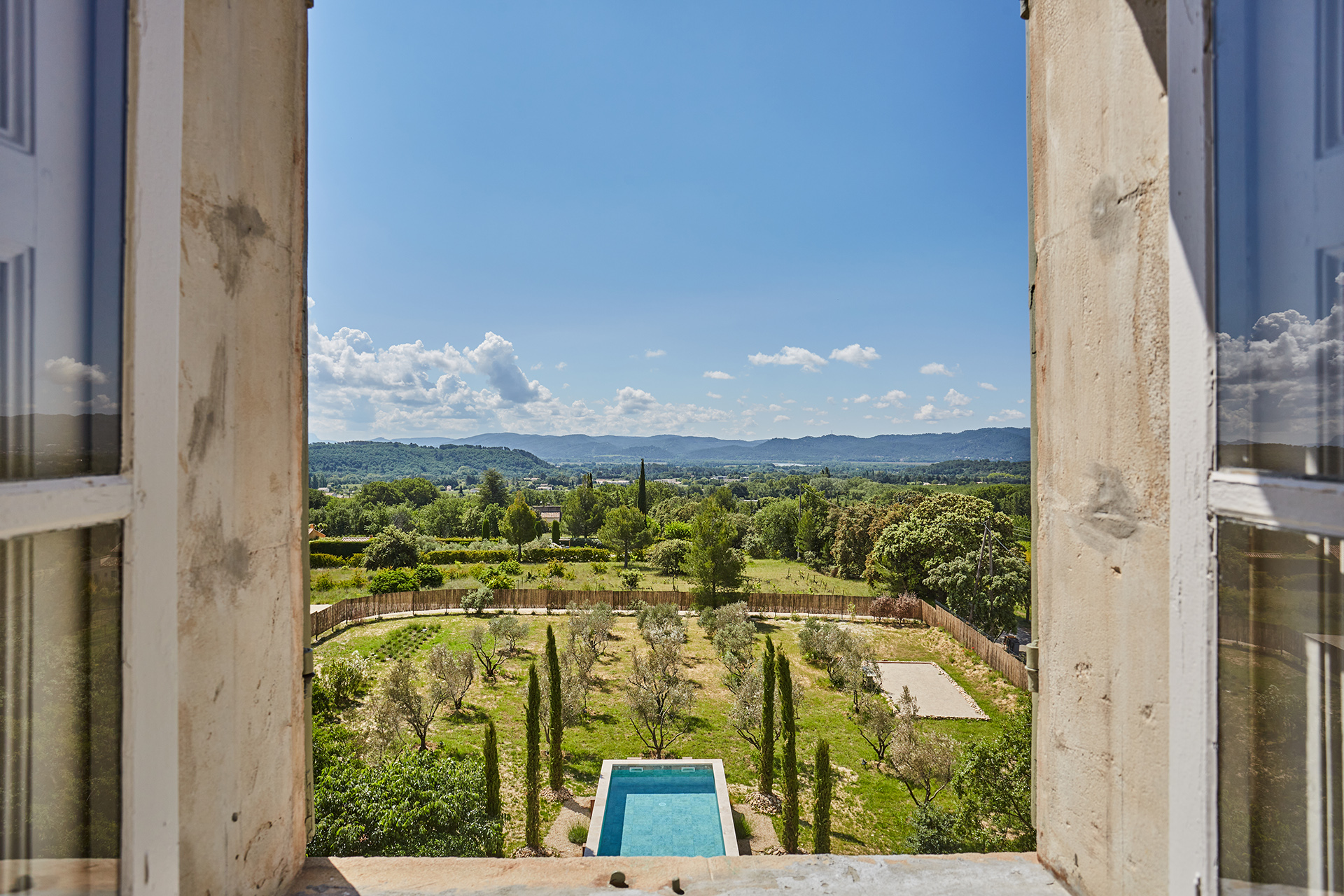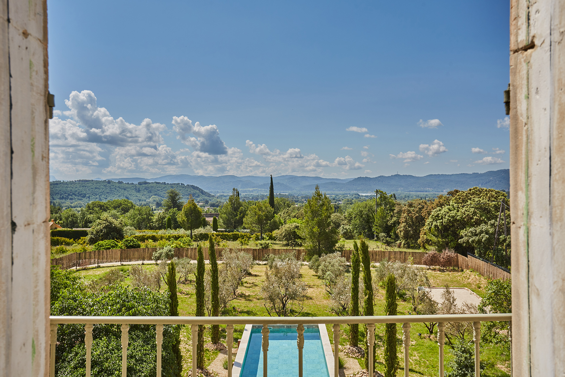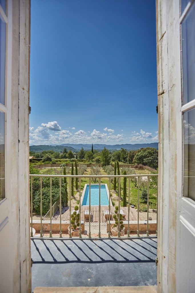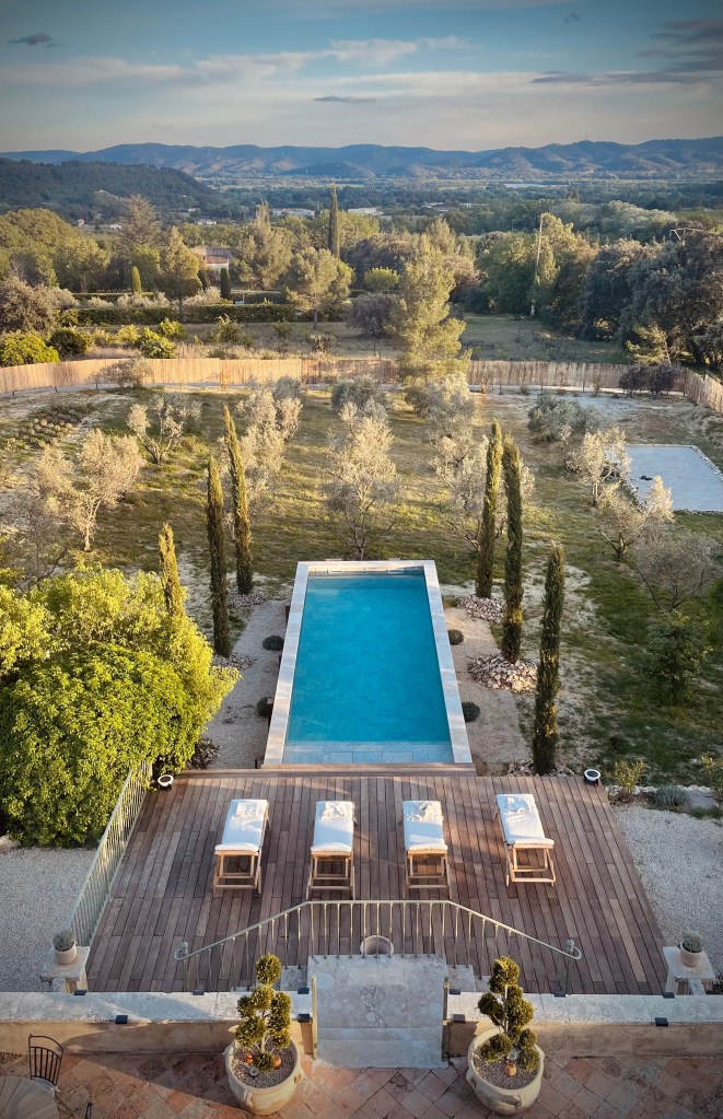Le bassin, semi-enterré, est conçu avec des matériaux en pierre, dont principalement du granit pour les revêtements. Une terrasse en bois démontable est installée au-dessus du réseau enterré. Des cyprès d’Italie et des oliviers sont plantés dans le jardin, créant ainsi une ambiance méditerranéenne.