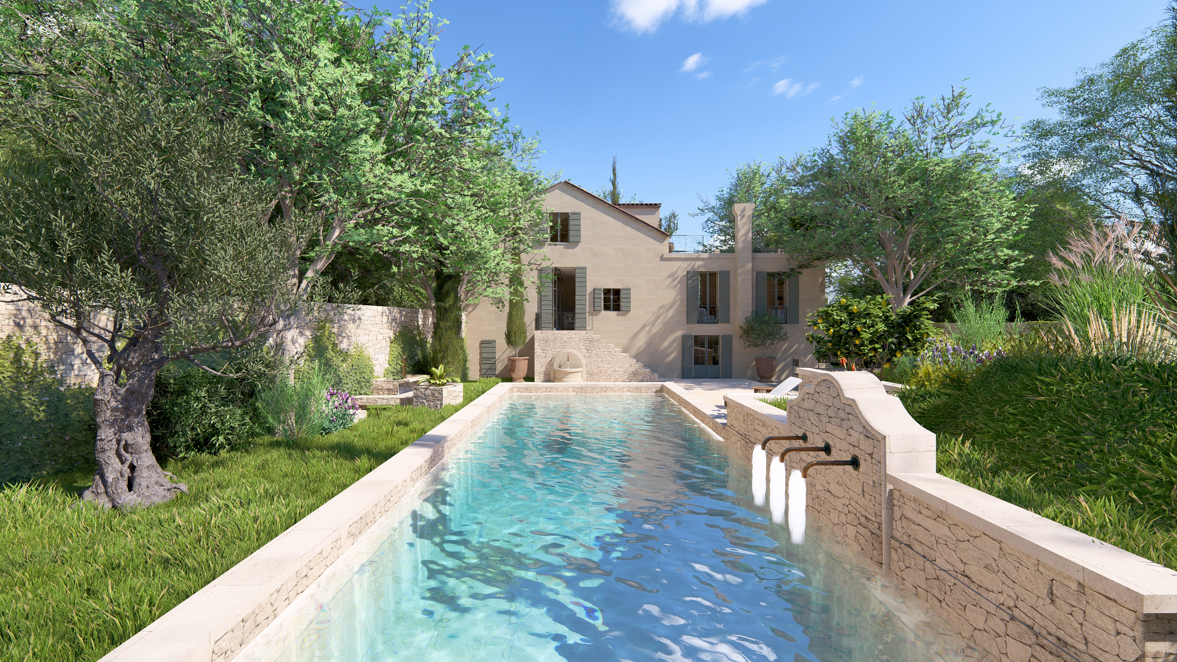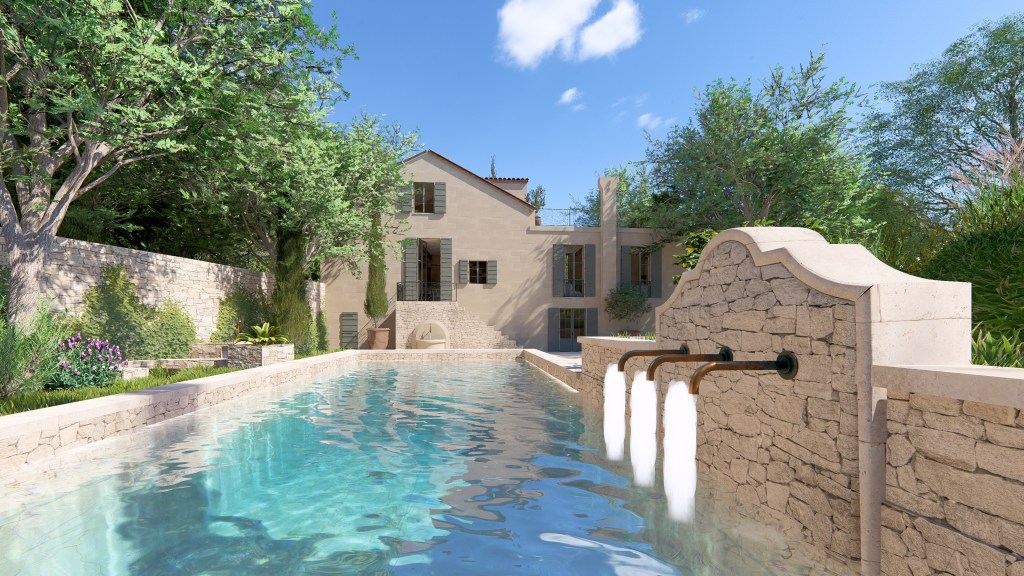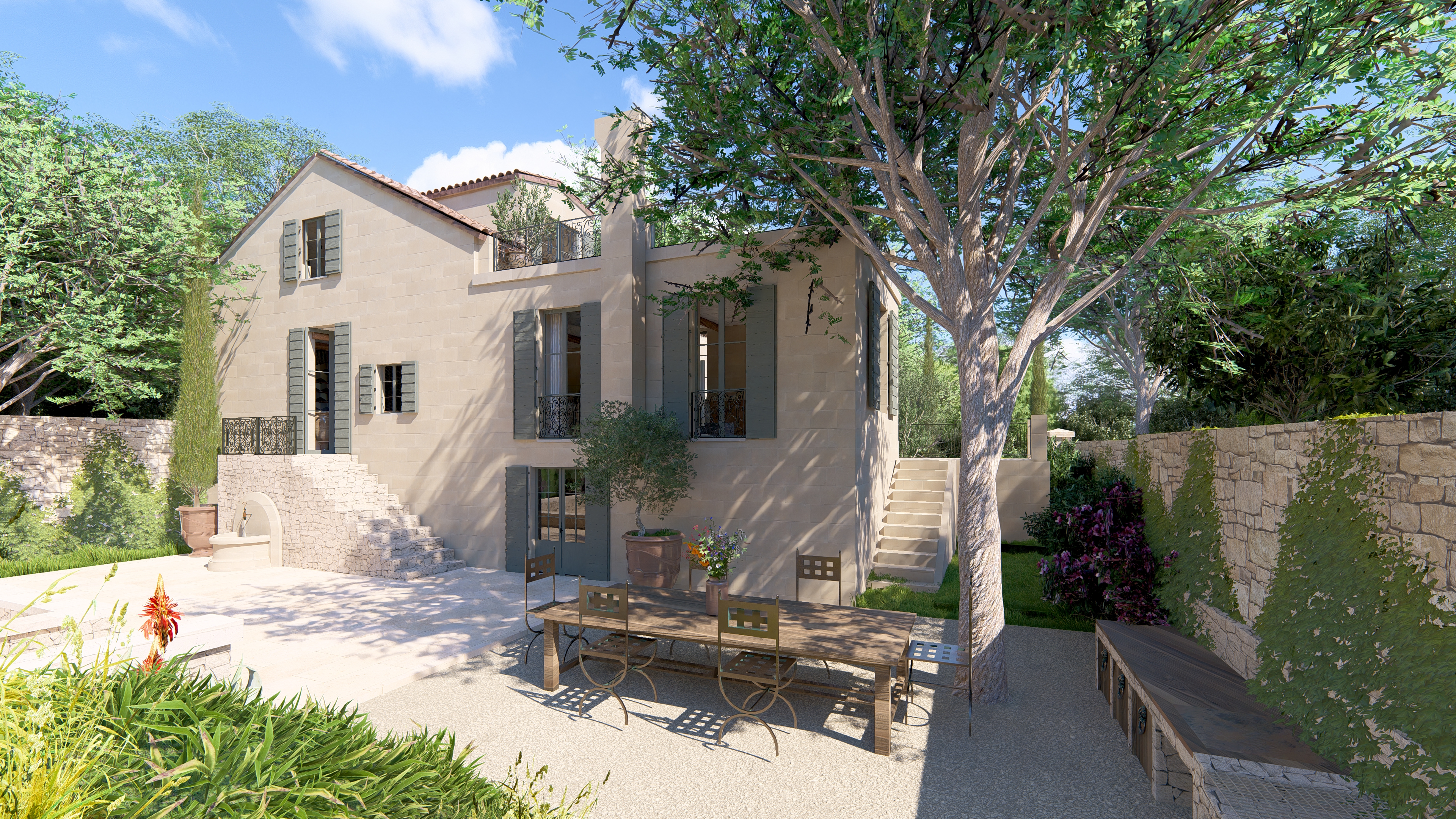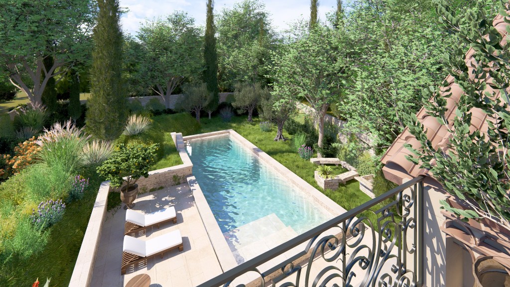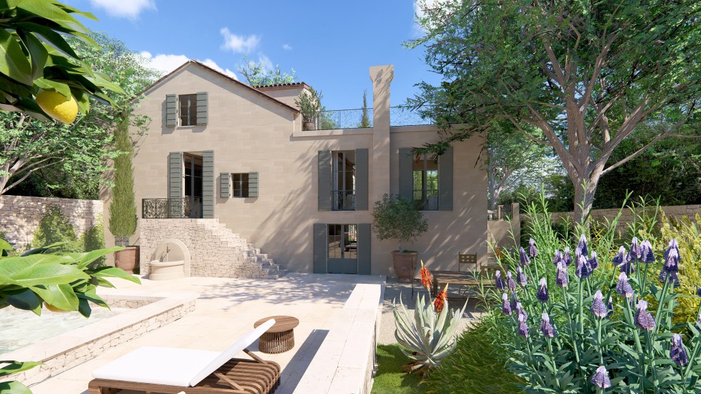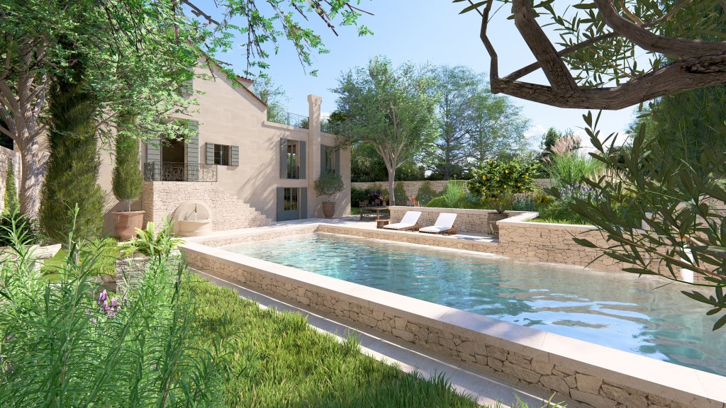 Projet de rénovation d’une maison individuelle de 330 m² située en secteur sauvegardé, en collaboration avec l’Architecte des Bâtiments de France. Aménagement du jardin avec la création d’une piscine bordée d’un muret en pierre calcaire, d’une margelle en granit et d’un revêtement en carrelage de type pierre de Bali. Aménagement du jardin avec des massifs de lavande, romarin, sauge, verveine, aloe vera et d’oliviers.